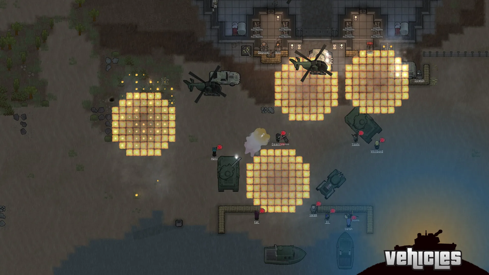 Vehicles can be attached with turrets. These differ from vanilla and do not use the verb system, however they also do not have hardcoded positions meaning they can be offset to any point on the vehicle. Turrets can also be attached to other turrets, allowing them to rotate around the axis of rotation when the parent turret also rotates. A good example of this is a mounted machine gun atop a tank’s main turret. There are a few other options for modders as well, including but not limited to projectile offsetting for alternating barrels, overheating mechanics, recoil, custom projectile flags at runtime (eg. faster projectile speed that is separate from the projectile def such as high velocity mortar rounds), and more.