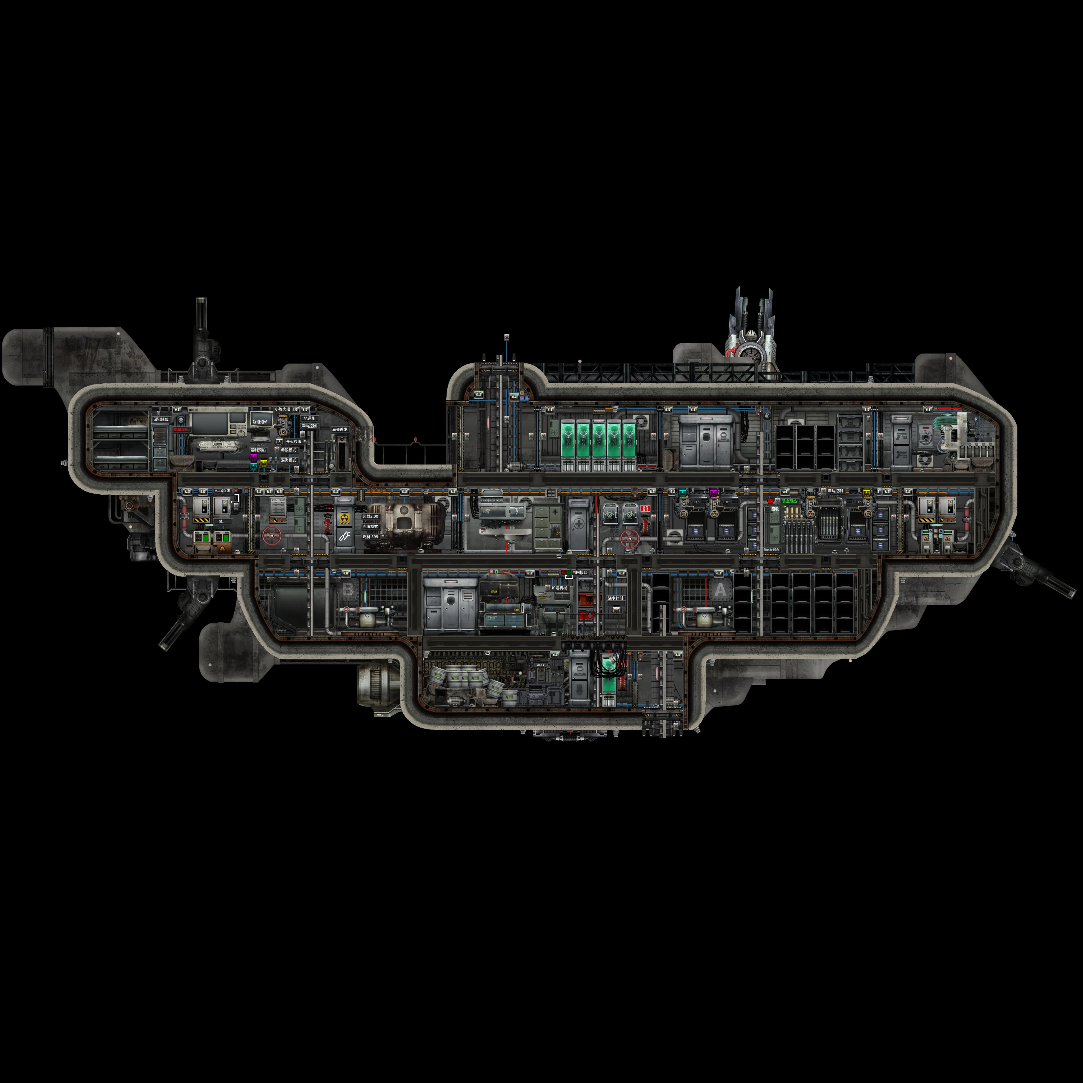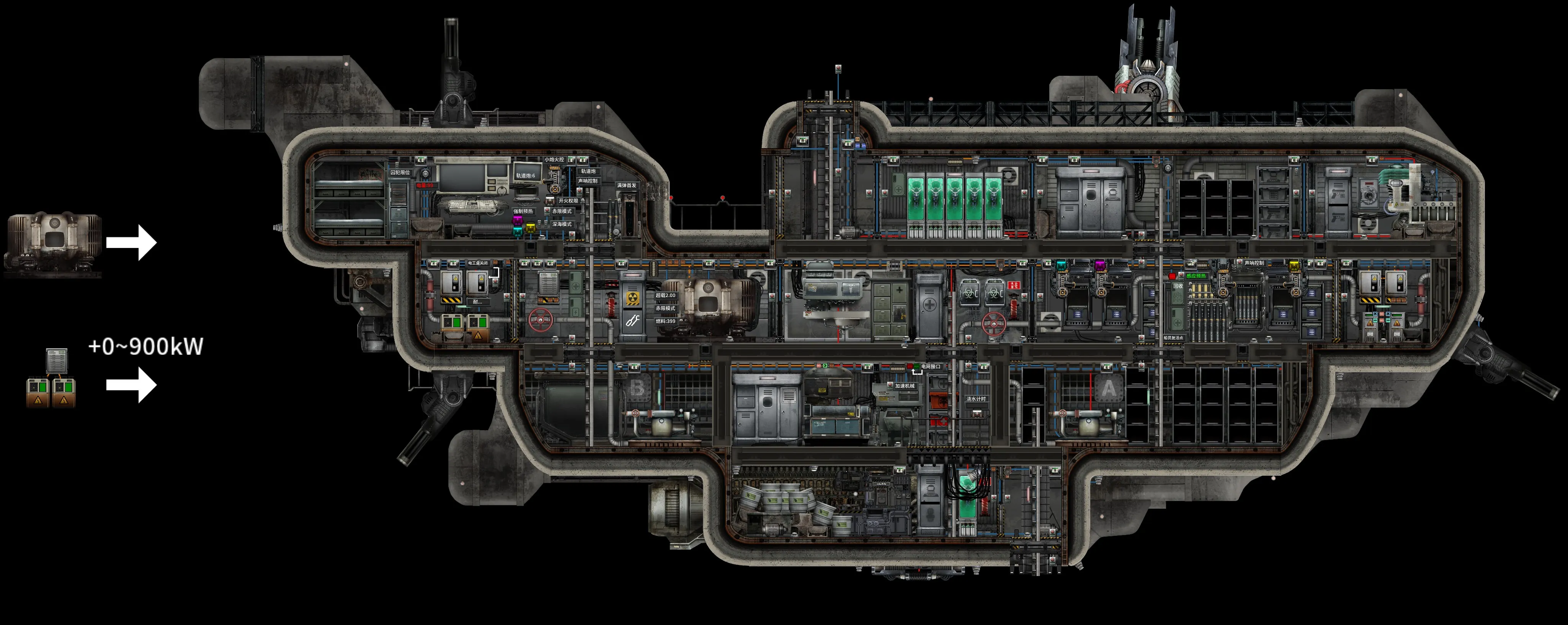 袋鼠超载型经过反应堆电池共同超载电路和自动排水水密门辅助压载改造,它的极限航速、下潜速度、加速减速、抵抗进水、沉后排空、分解、合成速度跟随超载倍率在原来的基础上进一步提升,经过超低温堆改造,耗能速度低至理论极限,性能和续航均达到官船极限。此外,通过组件实现了微改连射炮自动预热、舰长潜望镜多炮切换超越炮手控制连射炮、声呐箭头超越炮手控制轨道炮、下方自动放电线圈、装填提示、仓内进怪提示、浇水计时器、种植自动灭火警报。微改了装弹器可将电磁炮弹用连射炮打出极大提高了射速和输出,保持房间布局和家具外观把某些小柜换成大柜、床换成医疗床。在原有布局上加了下出仓口、舰长潜望镜、基因台更多弹药架和炮位远程打开加工台提取“装弹器上、被自动放在弹药架上的空弹”回收功能。极大保持了人少时的战斗性能和效率。首次出航注意:如果没装PF或是多人,需要修改火控室红色内存到30.1;舰长室衣物柜用奖章快速升级机修点出第二行天赋“改造”升级T3船壳;种子种一下。如果发现电路和路径问题会修正。