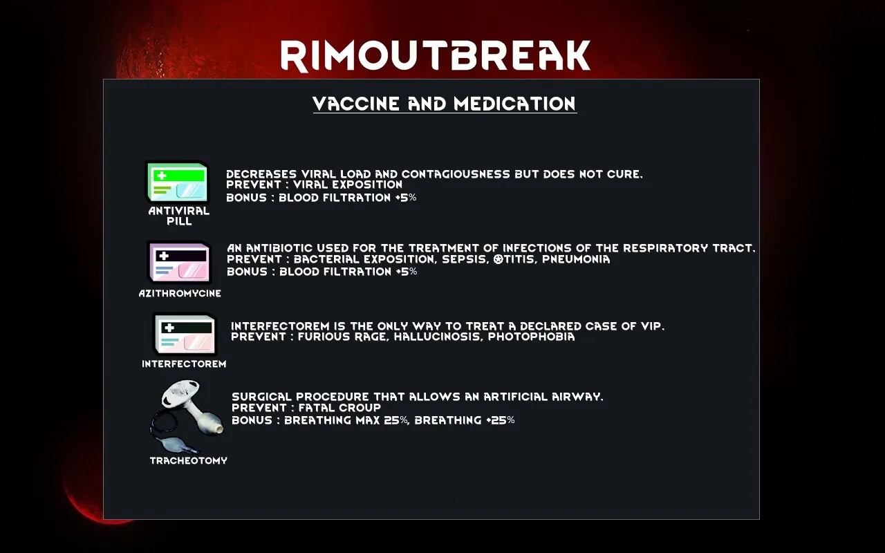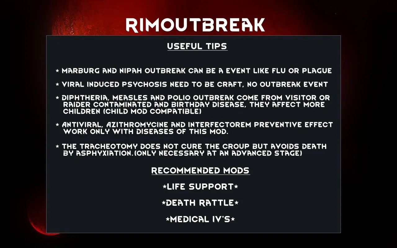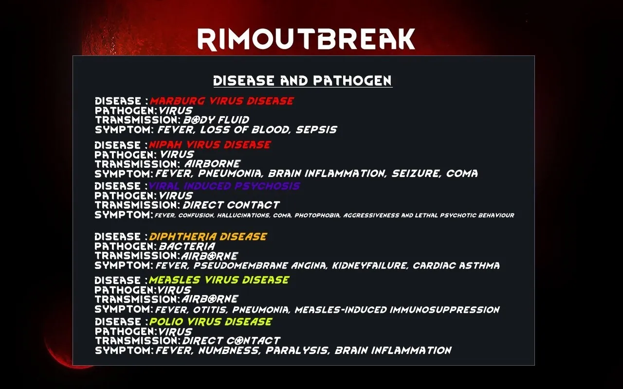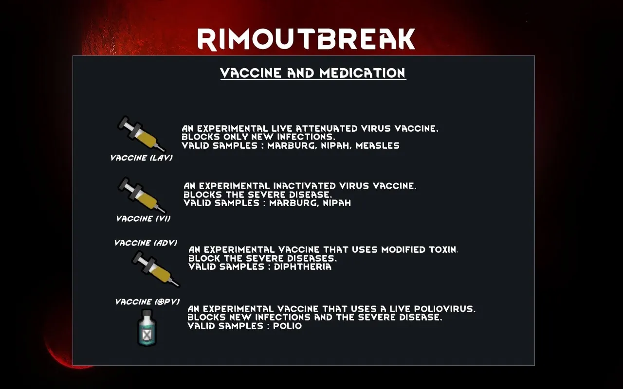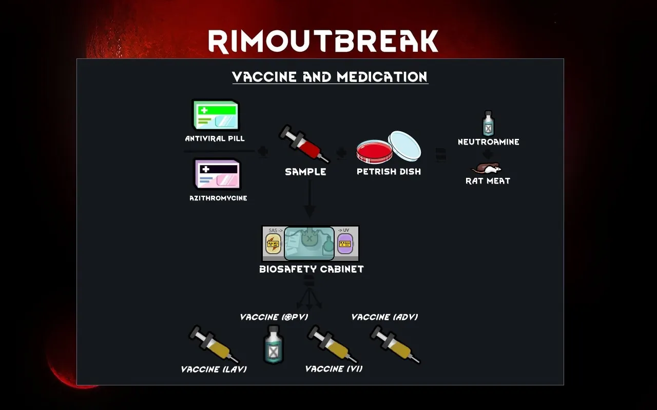 This mod adds new diseases, a vaccine process, and utilizes features of "Communicable Diseases" and "Diseases+"