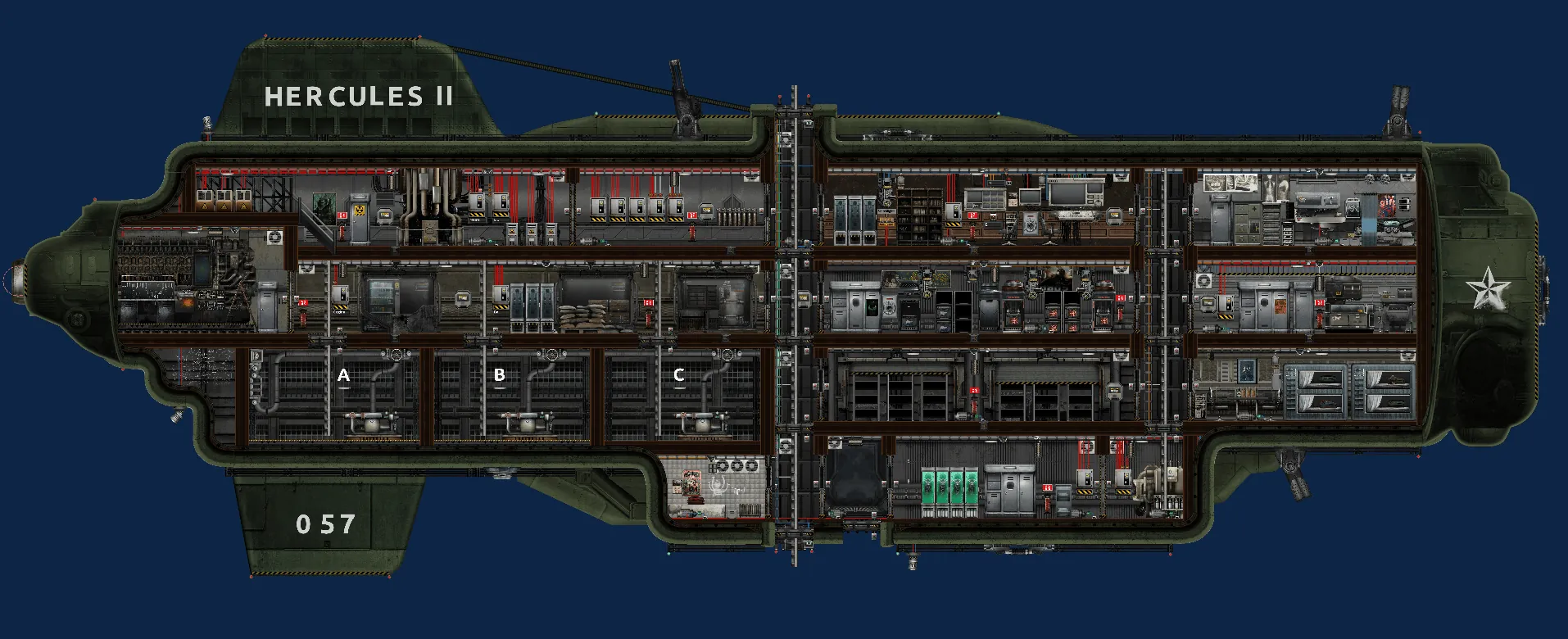 The venerable Hercules, slow, massive and ugly, and yet somehow ever so reliable. Its size requires a substantial crew to operate. Boasting full fabrication facilities, a crew quarters, substantial cargo capacity, a brig for prisoner transport and full interior CCTV, the Hercules may be old, but its still a reliable choice for Captains seeking to live in comfort and safety.