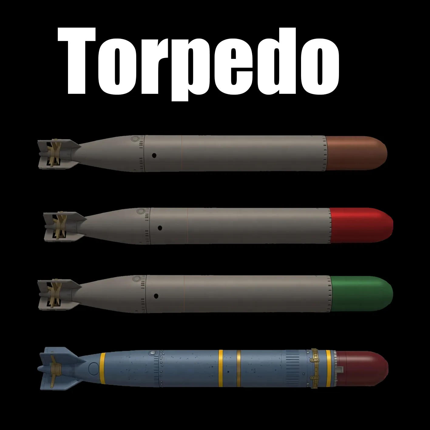 HE torpedo (orange head): The most basic model, equipped with a proximity fuse, a versatile weapon.
