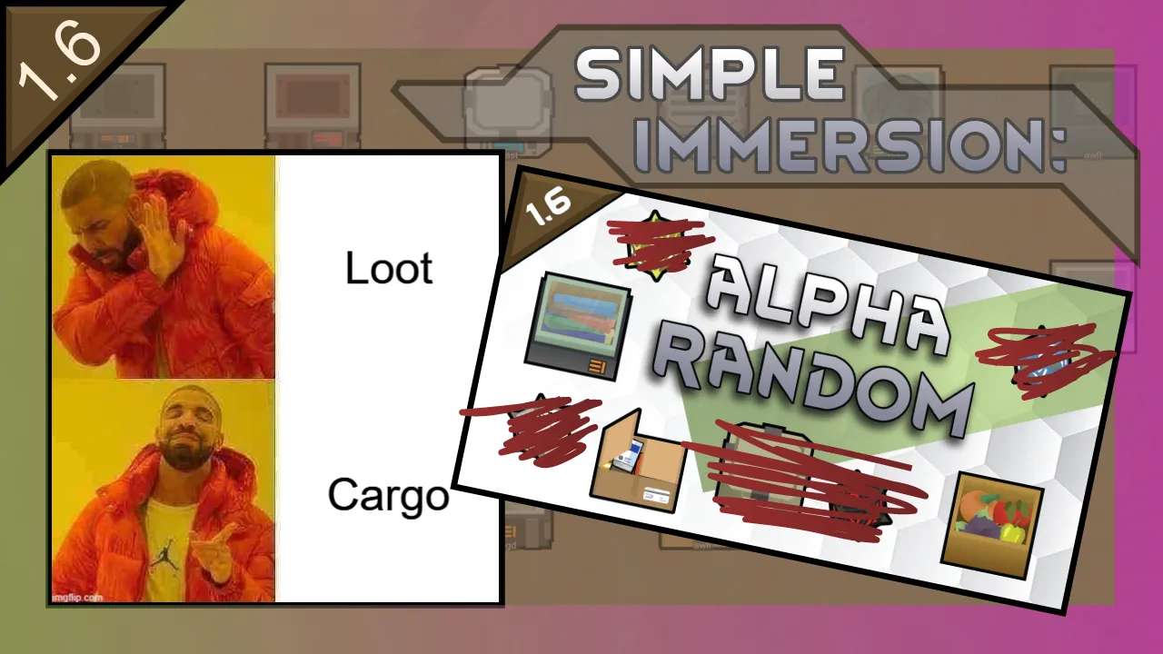 This mod rethemes Alpha Random such that the content is framed not as a fourth wall breaking meta video-game loot-box mechanic, but as a simple representation of the fact that people in the world are storing and transporting goods in appropriate containers, like we do in real life.
