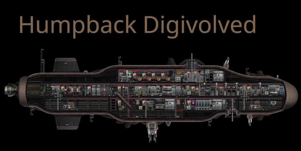 Keeping its original look and capabilities, this Humpback has been upgraded with modern electronics and AI assistants. Additional diving suit lockers have been distributed, the front ballast and airlock have been restructured, drainage improved, a bed and medfabcab have been added to the medbay, a captain's locker to command, and the deconstructor was linked up with the fabcab. All doors and hatches have been replaced with configurable "smart" variants.