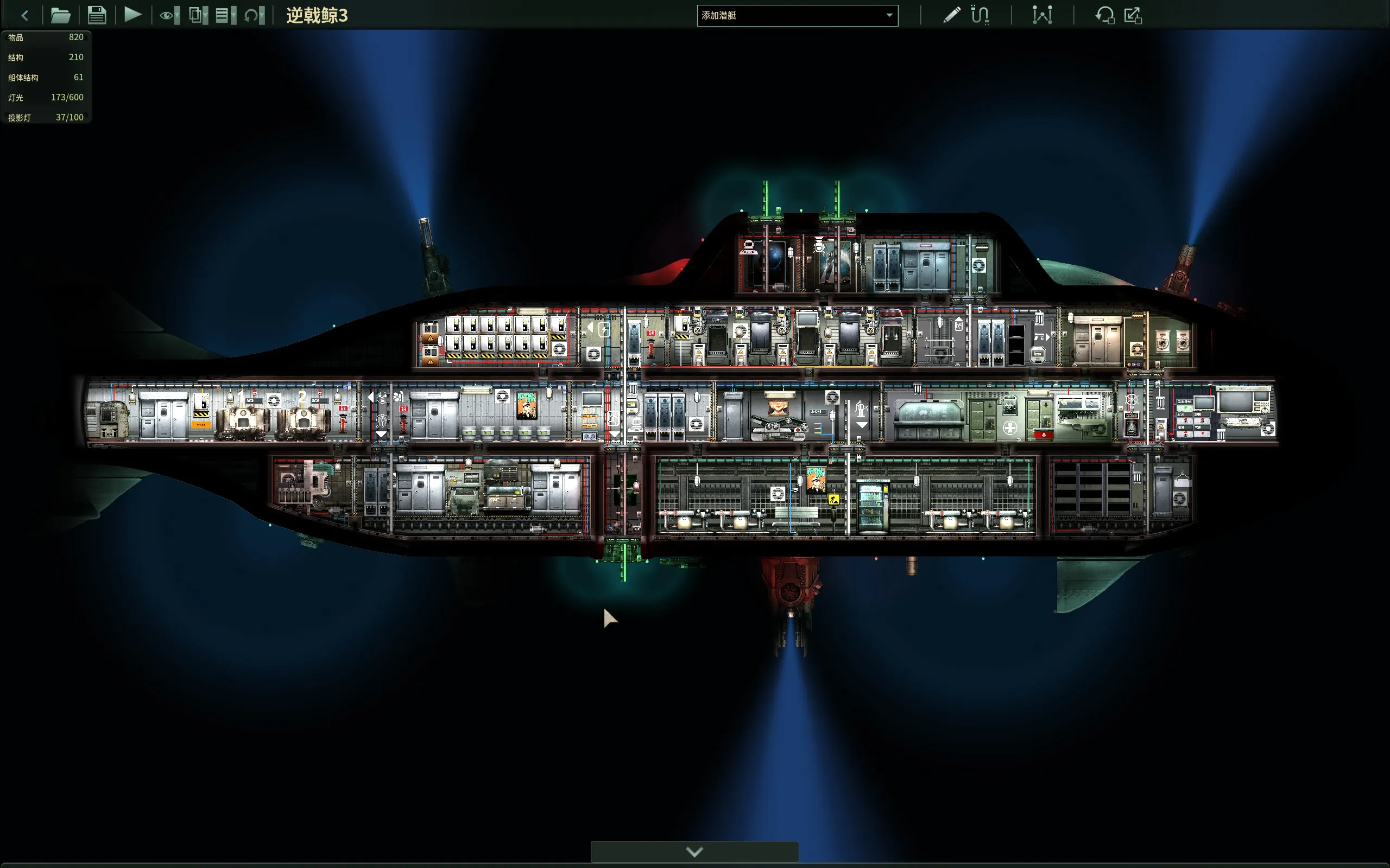 将逆戟鲸官船改造成5炮塔版本,优点是双反应堆设计双倍能源双倍消耗双倍大呲花,比原版船照明更加似人,加了一些新设备新柜子,缺点是船壳还是原版强度,引擎和水泵同样无力,新加入的设备使线路盒更容易损坏,价格比原版船贵一些,潜水服柜不能满足全船使用,优缺点还算平衡。