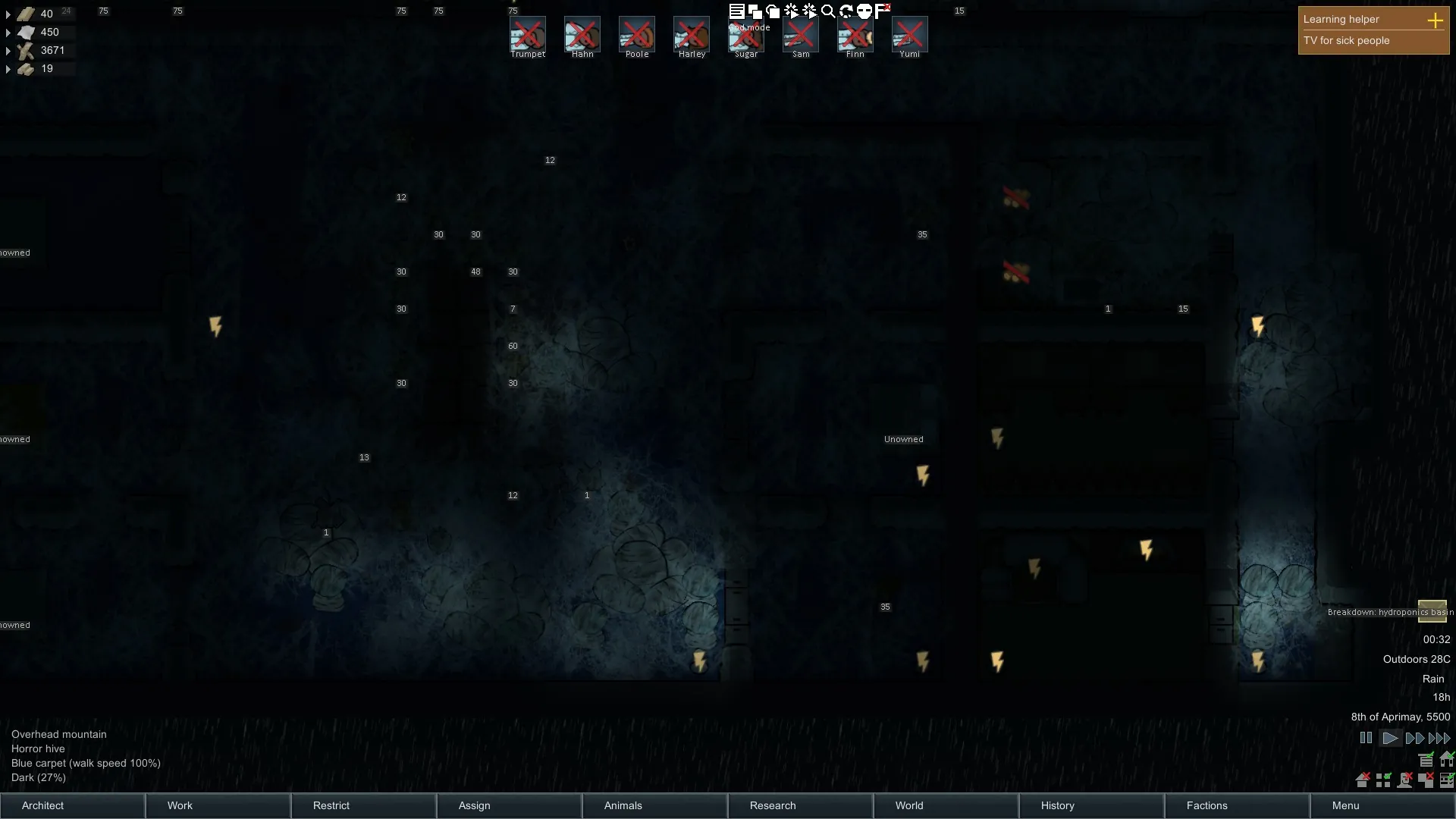 Adds a swarm of Unknown Horrors to the Rimworlds, they have hives of their own that will need to be assaulted and eradicated to ensure your safety. They infest and attack your colony, carving out a large hive and building it up over several tiers. With an overarching AI controlling the behaviour of the hive as they too try and survive. Making use of their every wit.