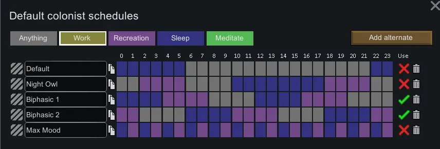 This mod allows you to customize various default settings to use during gameplay, such as the default schedules your colonists will assume. See below for a full list of settings.