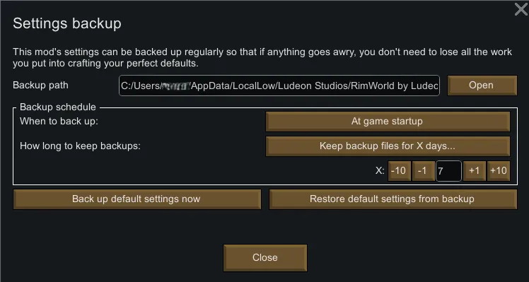 This mod's config file (your settings for this mod) gets pretty big and complex and it would kinda suck if something happened and you had to reconfigure everything from scratch. So now you can back up this mod's settings through the mod settings window (in General settings). Automatic periodic backups are enabled by default.
