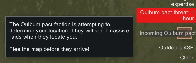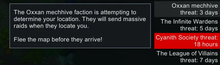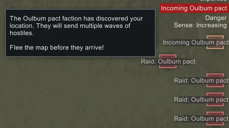 [*] [b]Warning Alert Mean[/b] and [b]Warning Alert Variance[/b] control when you first get an alert telling you how much time you have before the faction arrives. The Warning Alert Mean is the number of hours [i]before[/i] the Raid Mean Delay that you get a warning, so smaller values mean that you get less forewarning, while larger values mean more forewarning. In vanilla, these are 276 and 24 respectively, effectively meaning that you always get the alert between 14 and 16 days after first arriving on a map. [b]NOTE:[/b] If (Raid Mean Delay - Raid Delay Variance) is a lower value than (Warning Alert Mean + Warning Alert Variance), then you won't get a warning alert until right when the raid happens.