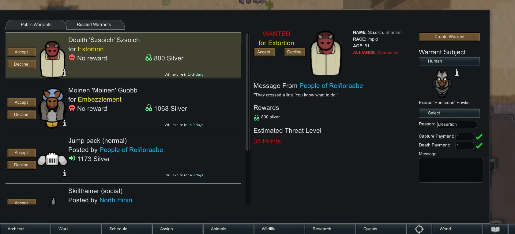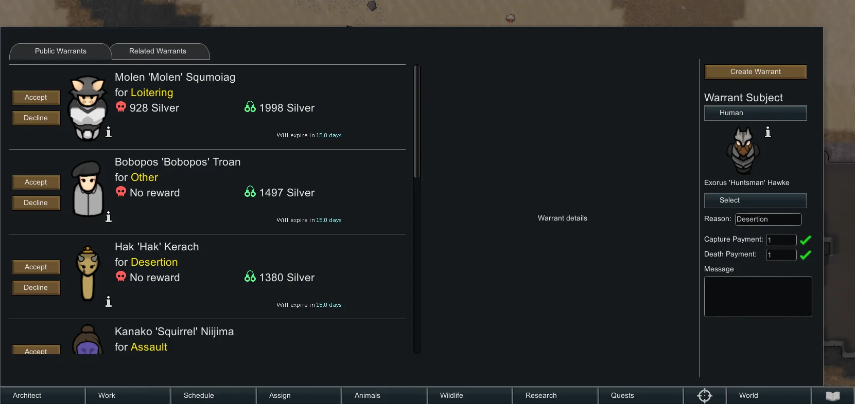 Also adds functionality to create your own warrants and have them accepted by other factions. Have a pawn that was captured and want to get them back? - Post a warrant and offer a reward, maybe a faction will accept it and bring them back to you. What about a world pawn? Maybe a faction leader that you want dead? - Post a warrant and offer a price on their head to have them killed! Just make sure you have the money to pay up, factions do not respond well to being scammed.