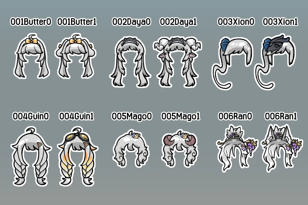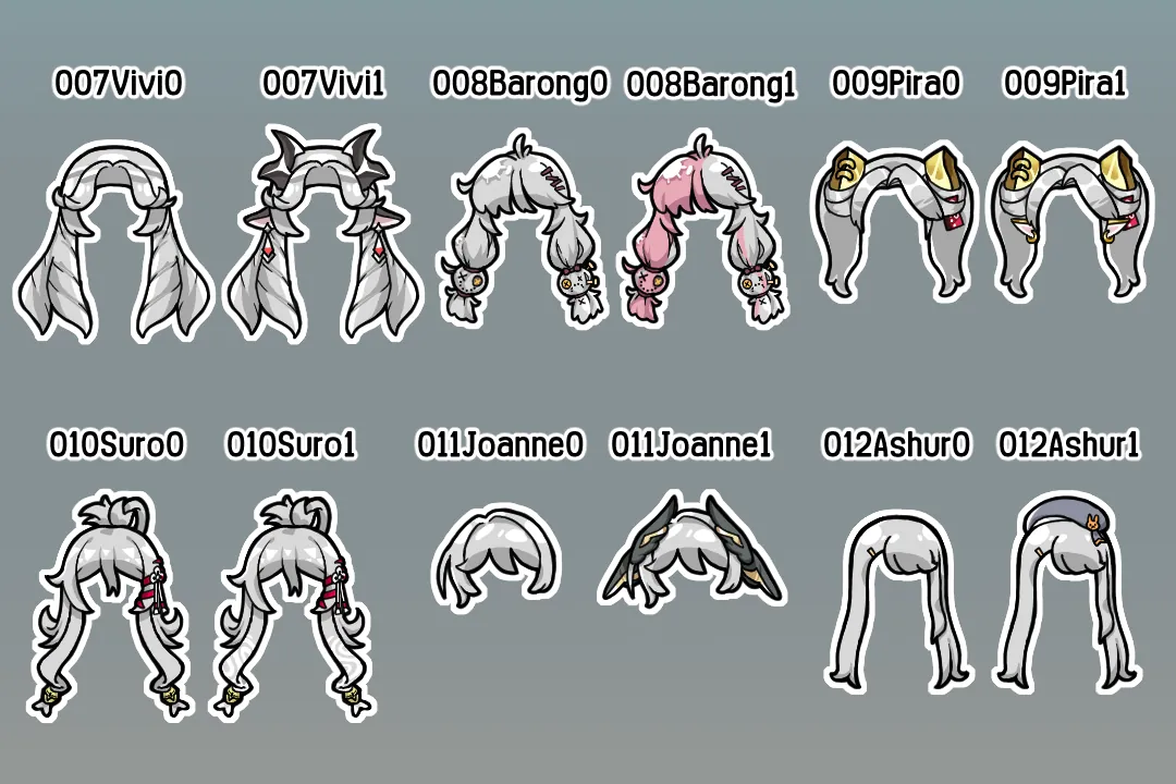 (As of 2025-12-18) Hairstyles for 22 characters, 2 hairstyles per character. A total of 44 hairstyles.