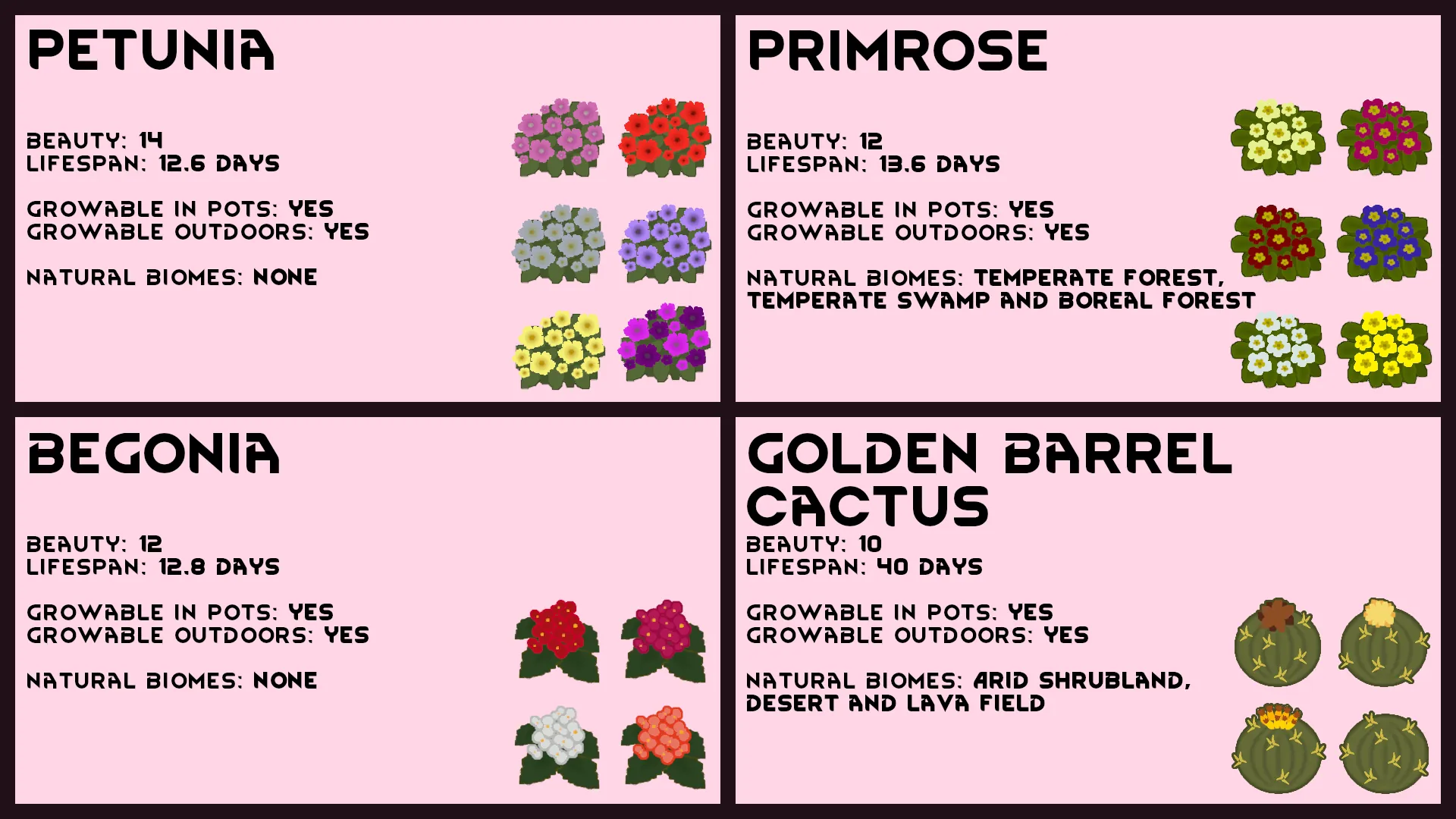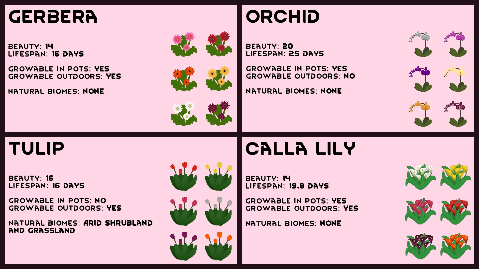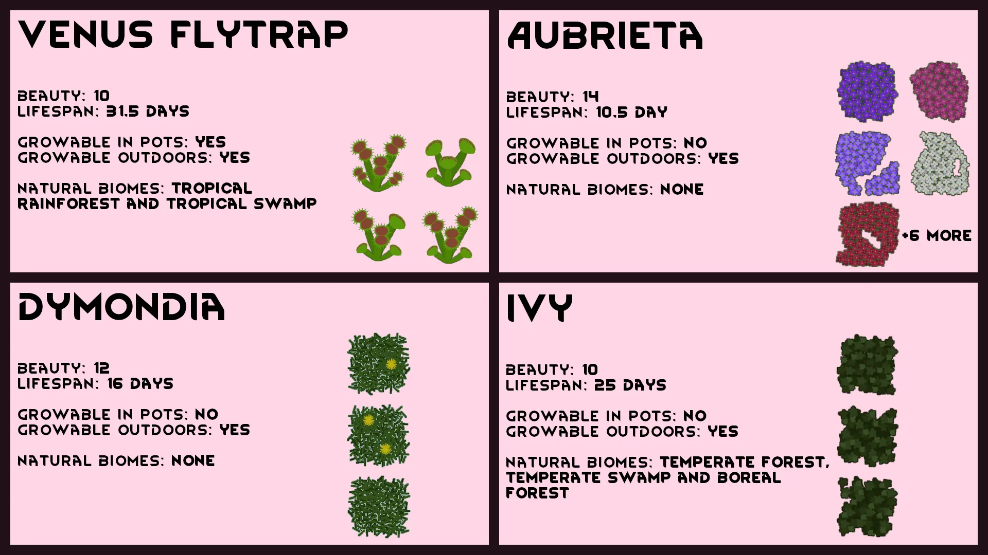 [i]Gerbera, Begonia, Calla Lily, Tulip, Petunia, Primrose, Orchid, Venus Flytrap, Golden Barrel Cactus, Aubrieta, Ivy, Dymondia, Lilac, Hydrangea and Wisteria.[/i]