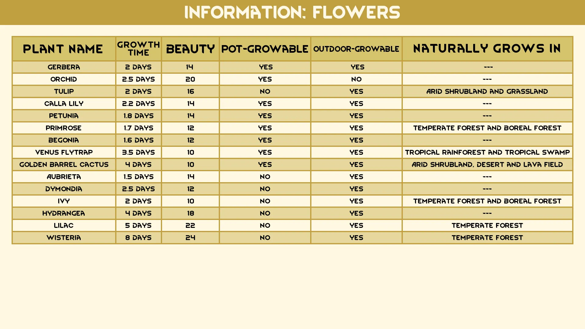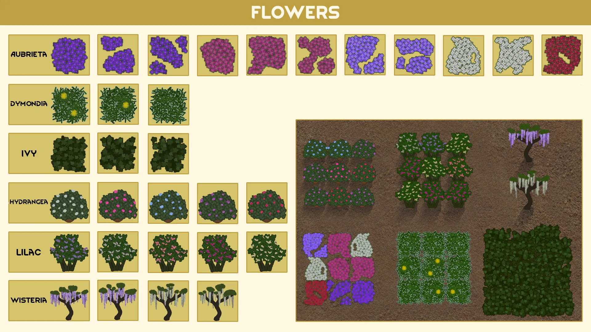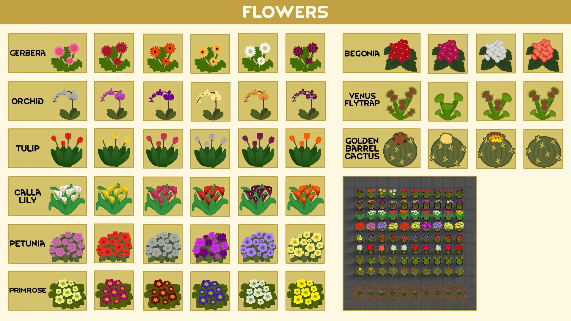 [i]Gerbera, Begonia, Calla Lily, Tulip, Petunia, Primrose, Orchid, Venus Flytrap, Golden Barrel Cactus, Aubrieta, Ivy, Dymondia, Lilac, Hydrangea and Wisteria.[/i]