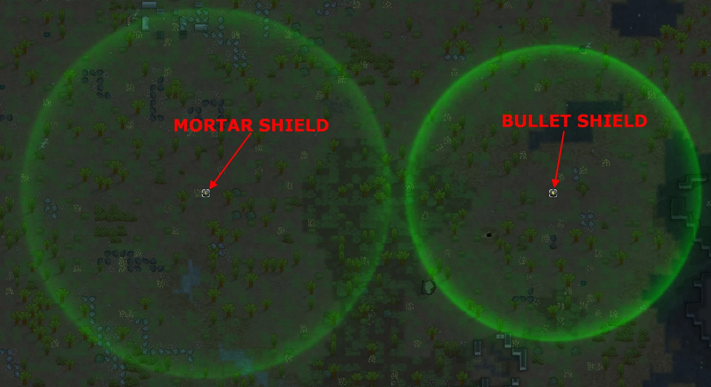 These shields project an aura around them which will block a certain amount of incoming enemy fire before dissipating and leaving your colonists vulnerable. Shields take 60 seconds to recharge; users with XML Extensions enabled can adjust the hitpoints of the aura to their own liking.