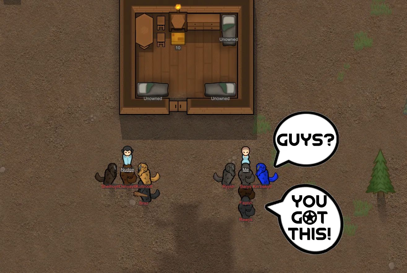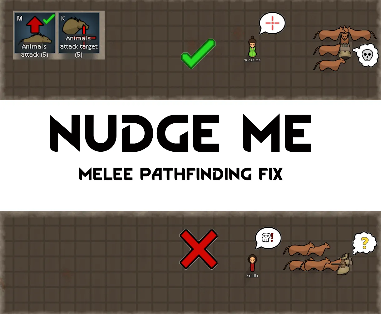 [b]Nudge Me[/b] is a targeted bug-fix mod for melee combat pathing. As of RimWorld 1.6, pawns can get stuck while attacking enemies. This is a RimWorld Core issue and is not related to any DLC. Pawns may idle behind other pawns even when a valid path to the target exists. This can occur even with just two pawns attacking a single enemy.