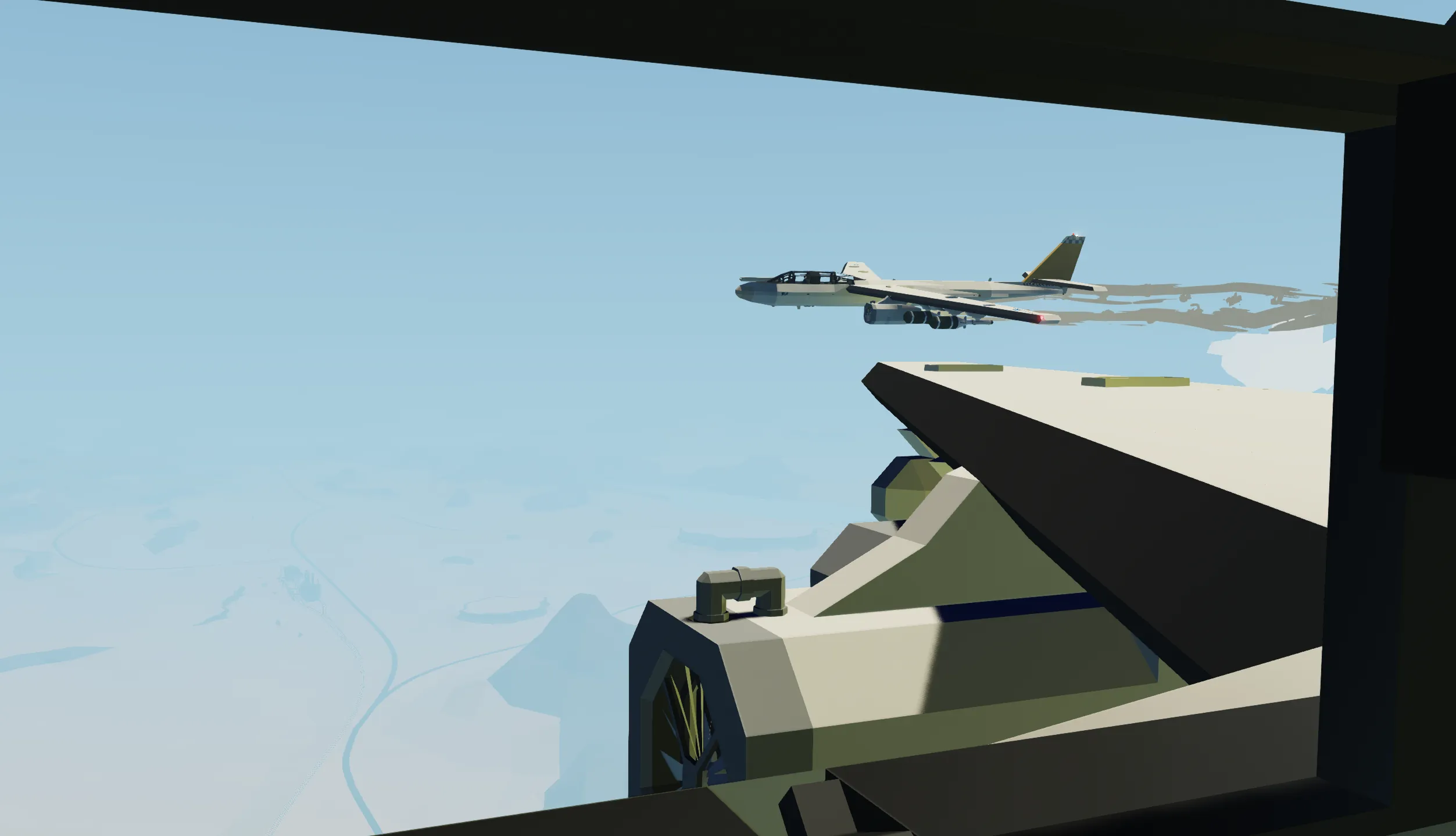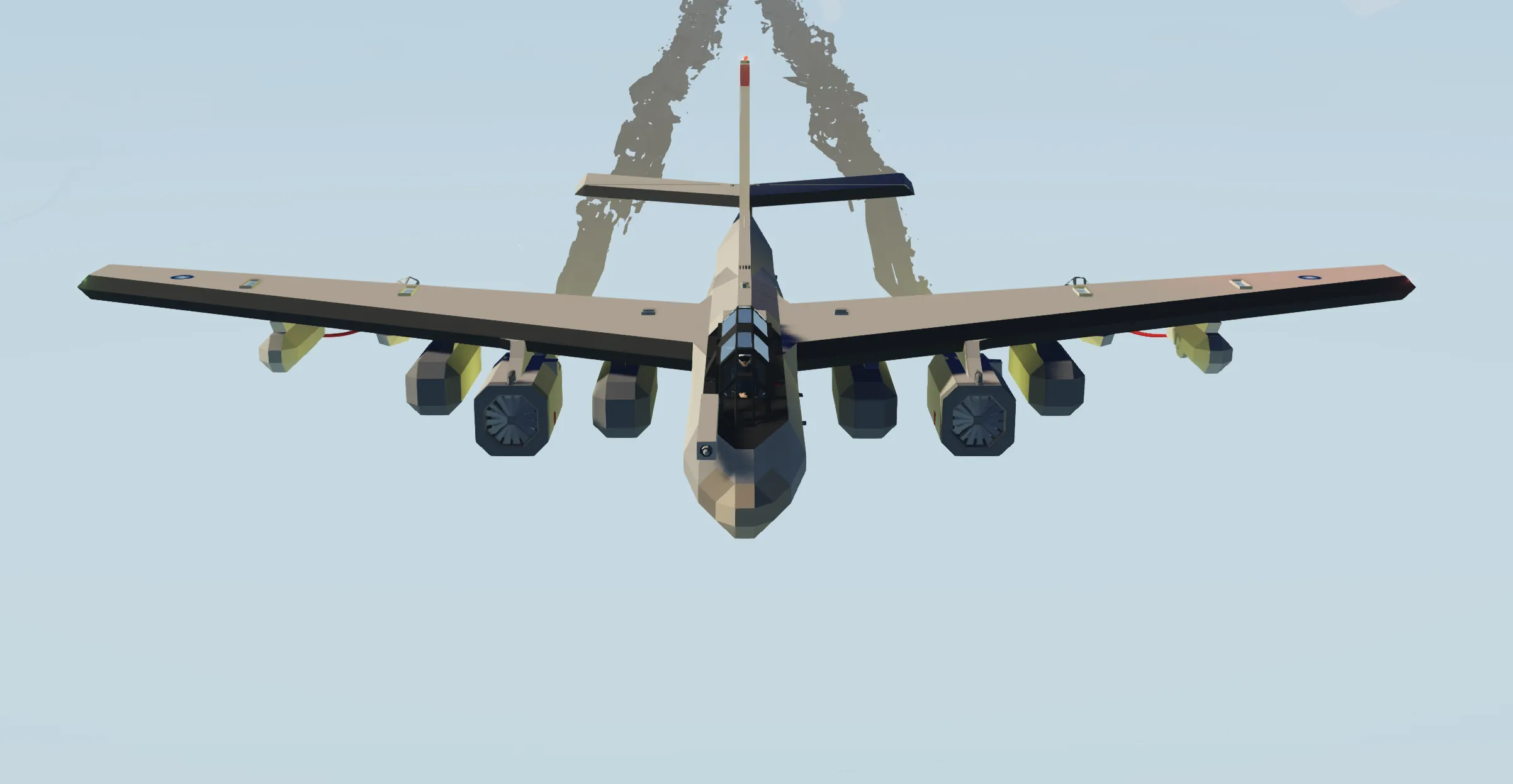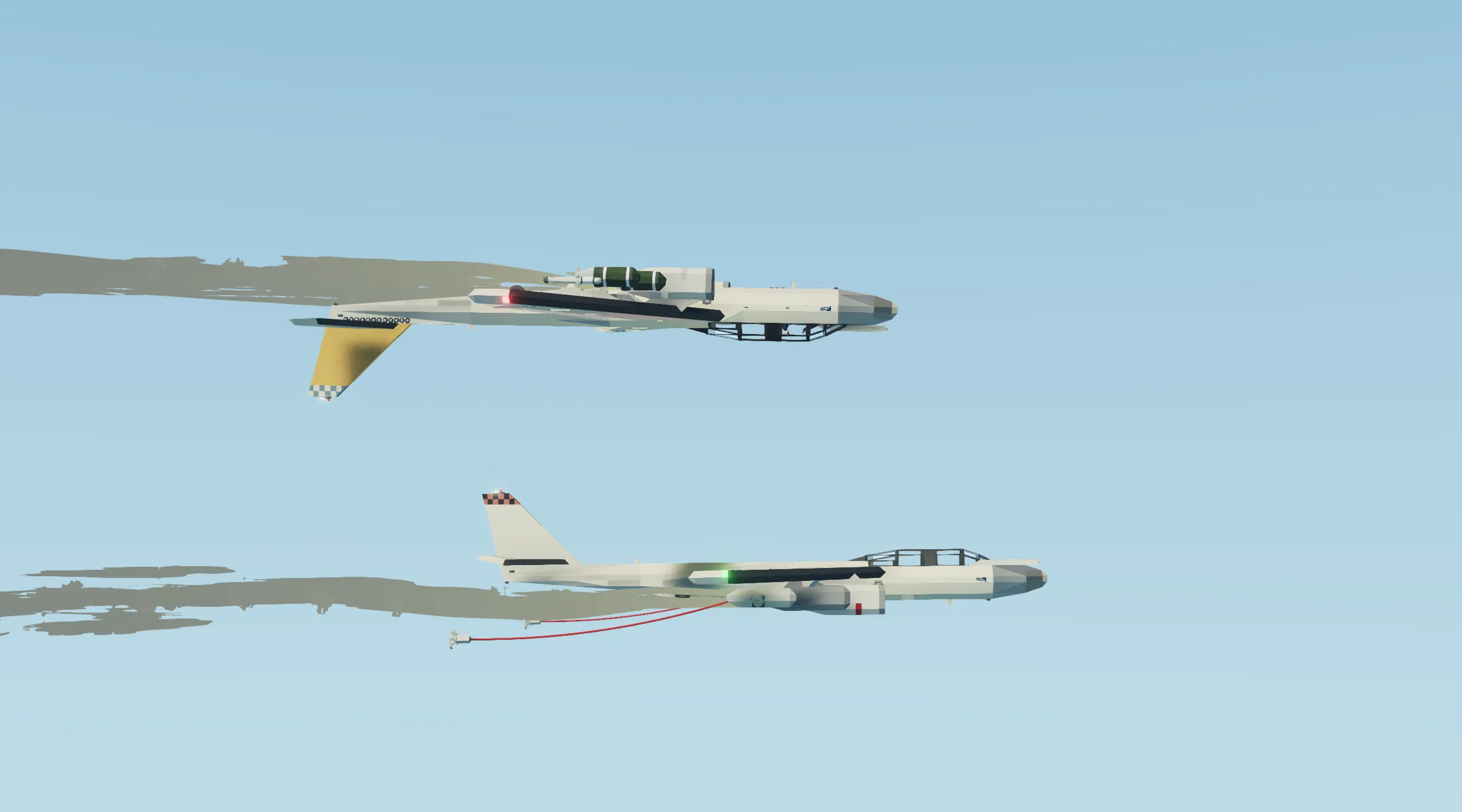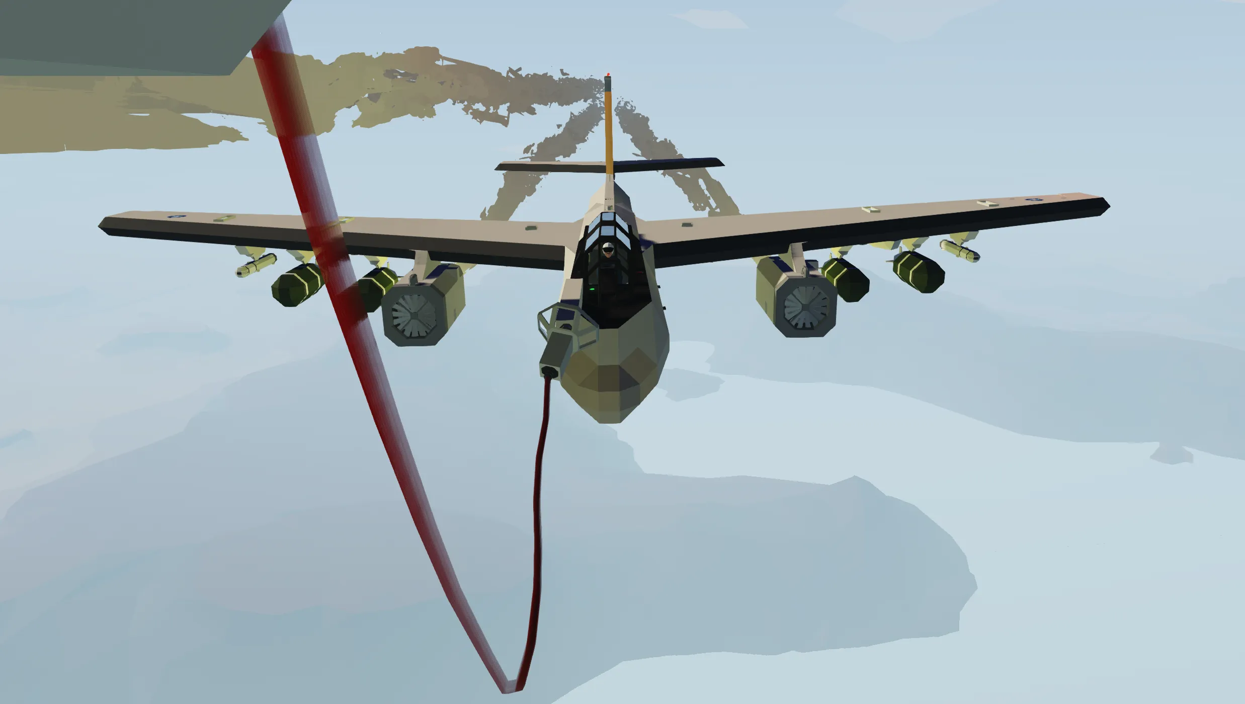 The Avion KB-33 Stratowarrior is an air refuel tanker, converted from the B-33 Stratowarrior bomber. This tanker replaces the bomb bay and hardpoints with a larger internal fuselage tank and fixed external fuel tanks, for a total of 25000 L of fuel capacity. Two drogue basket pods are installed to enable simultaneous refueling operations. This tanker lacks guidance systems and hardpoint stores to minimize performance impact, only keeping the radar and radar detector for navigation and self defense.