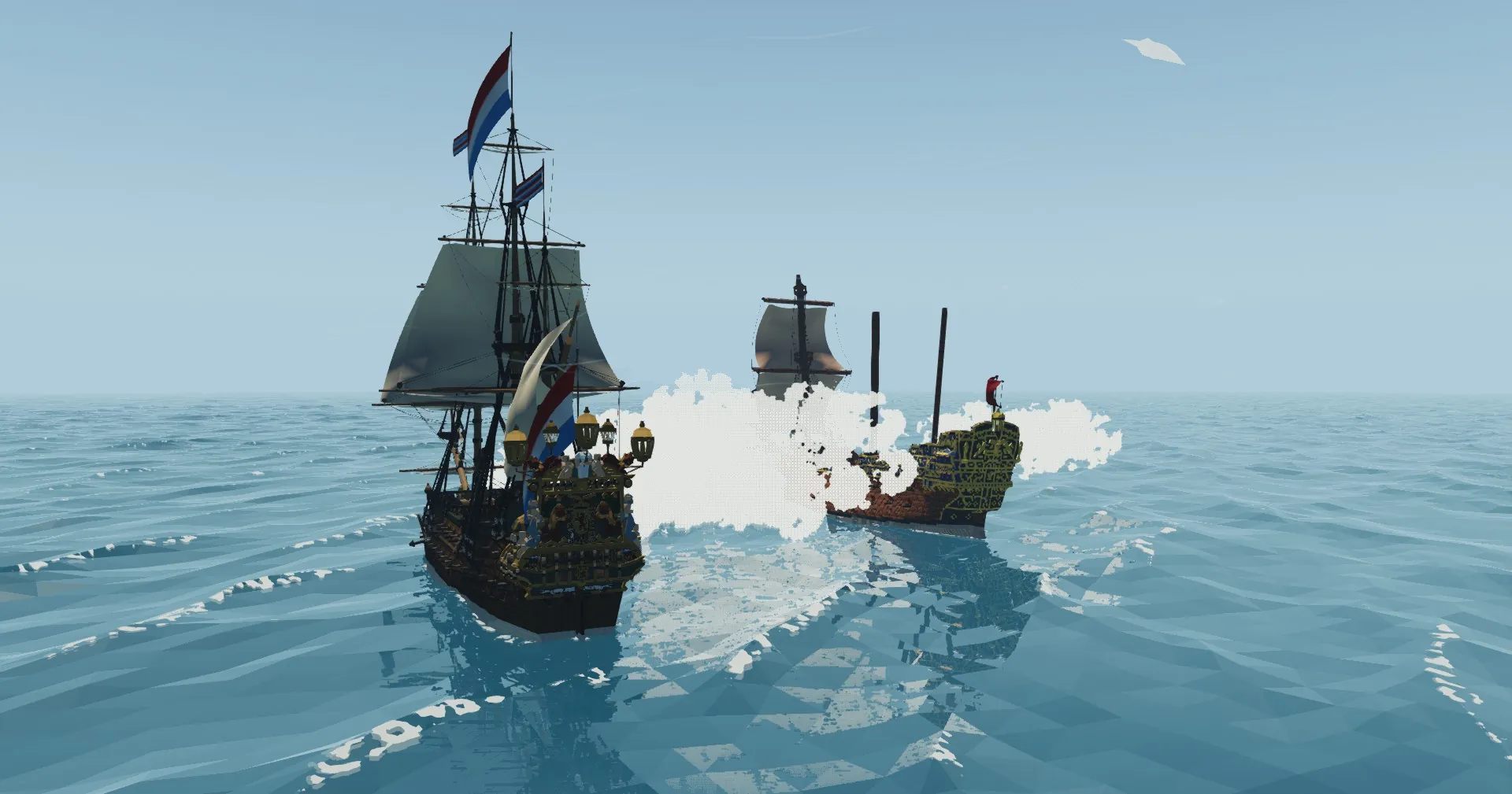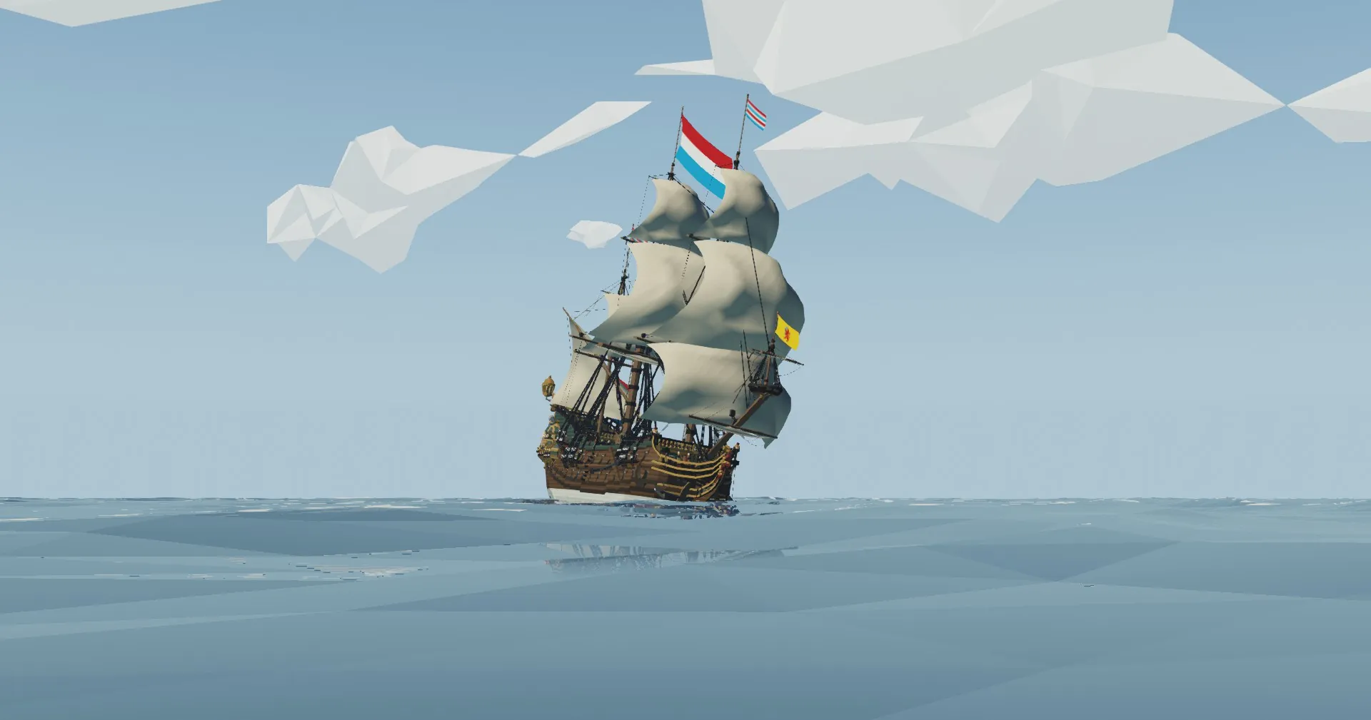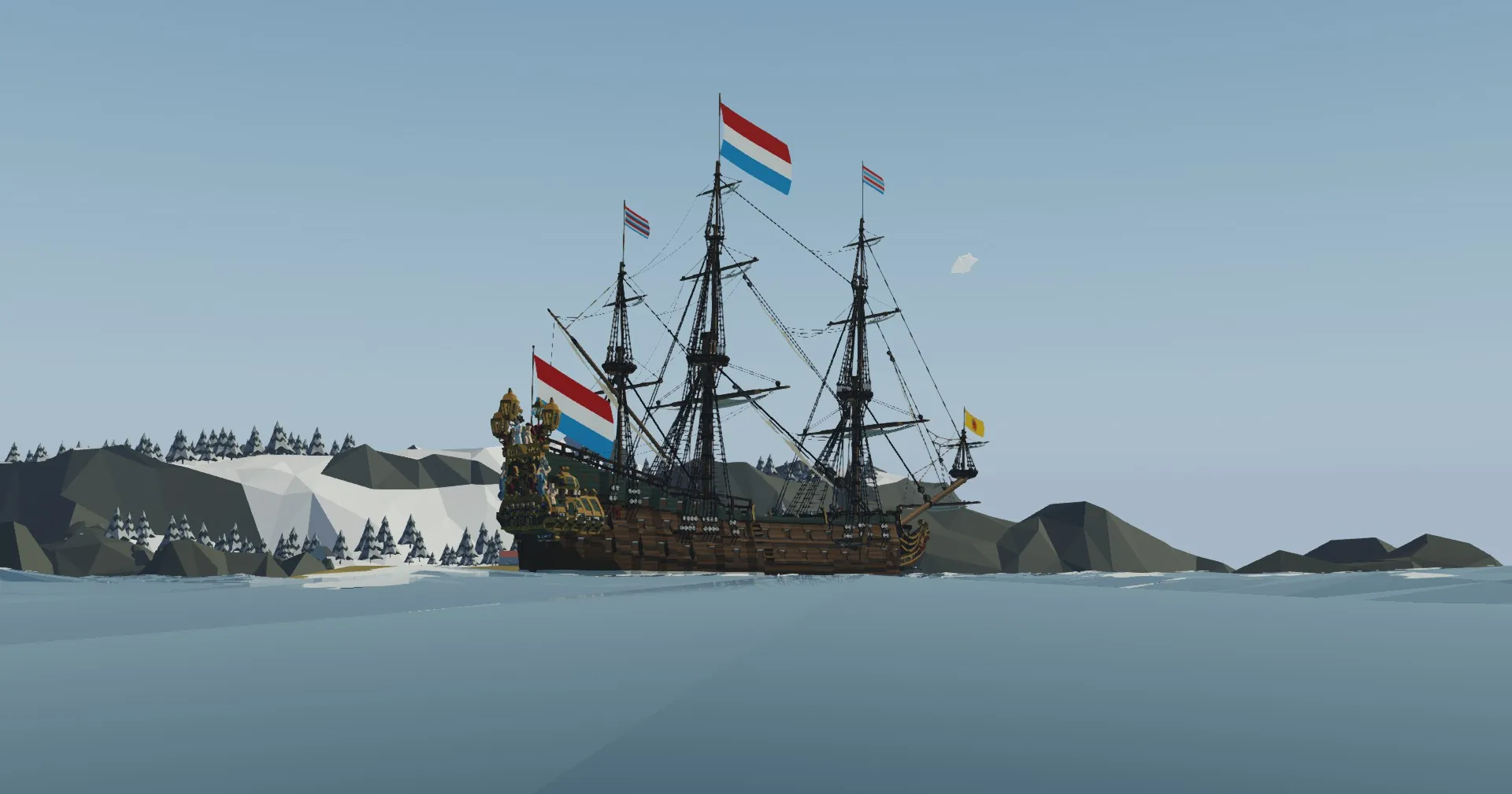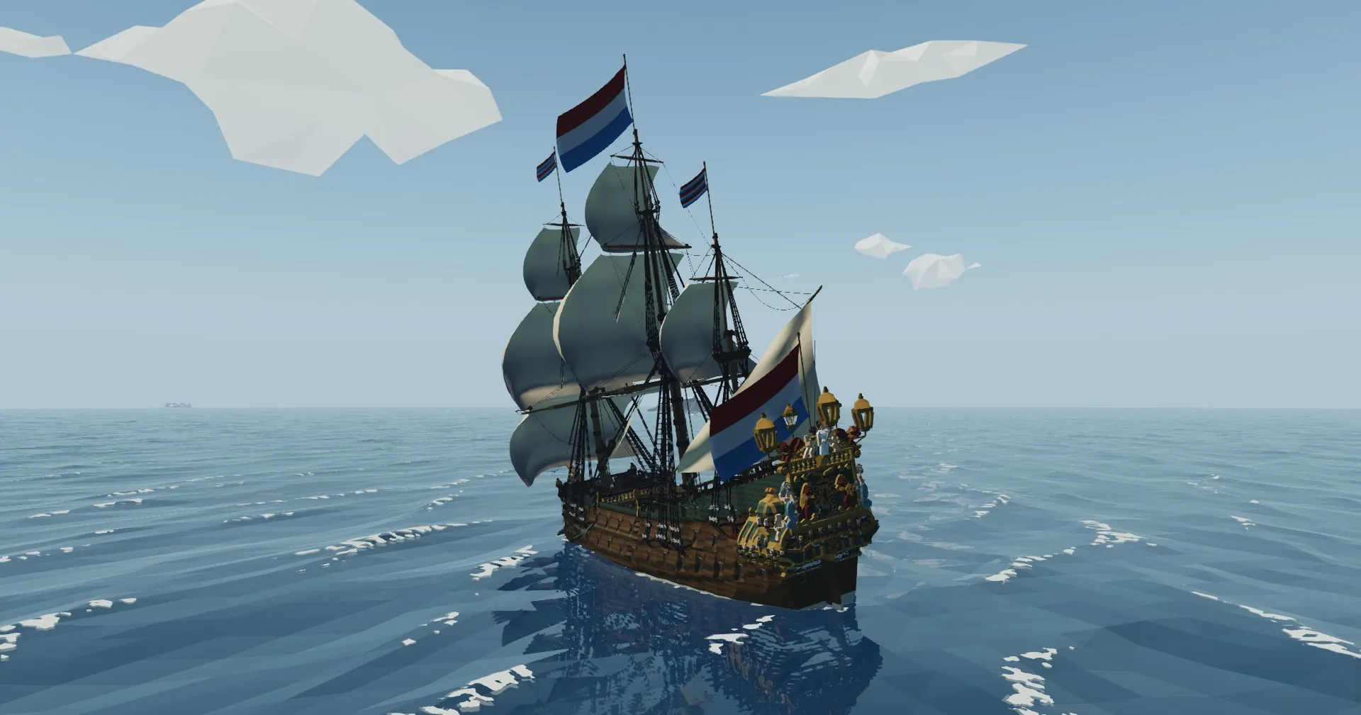 To make De Zeven Provinciën actually look good in-game, I decided the best option was to use two mods I’ve made: Larger Flags and European Naval Ensigns. NEITHER OF THESE ARE REQUIRED FOR THE SHIP TO FUNCTION CORRECTLY; however I would 𝐬𝐭𝐫𝐨𝐧𝐠𝐥𝐲 recommend you use these two mods in conjunction with her. Trust me, they make her look 100x better than she would without these flags!!! I would also recommend downloading a mod which adds smoke to cannons, as this is how they appeared during the age of sail and would be accurate for this ship.