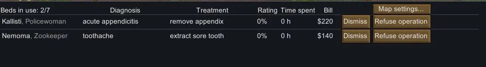 After installing the mod, check the map settings on the new patients screen. It allows you to set a timetable on the hours you want to receive patients (green squares). It also allows you to open/close your hospital. If you start a hospital it is recommended to have plenty of beds and open it only one hour a day and disable surgery. You can configure the kind of medicine they will get (herbal,glitter...) and the kind of meals(lavish, simple,...).