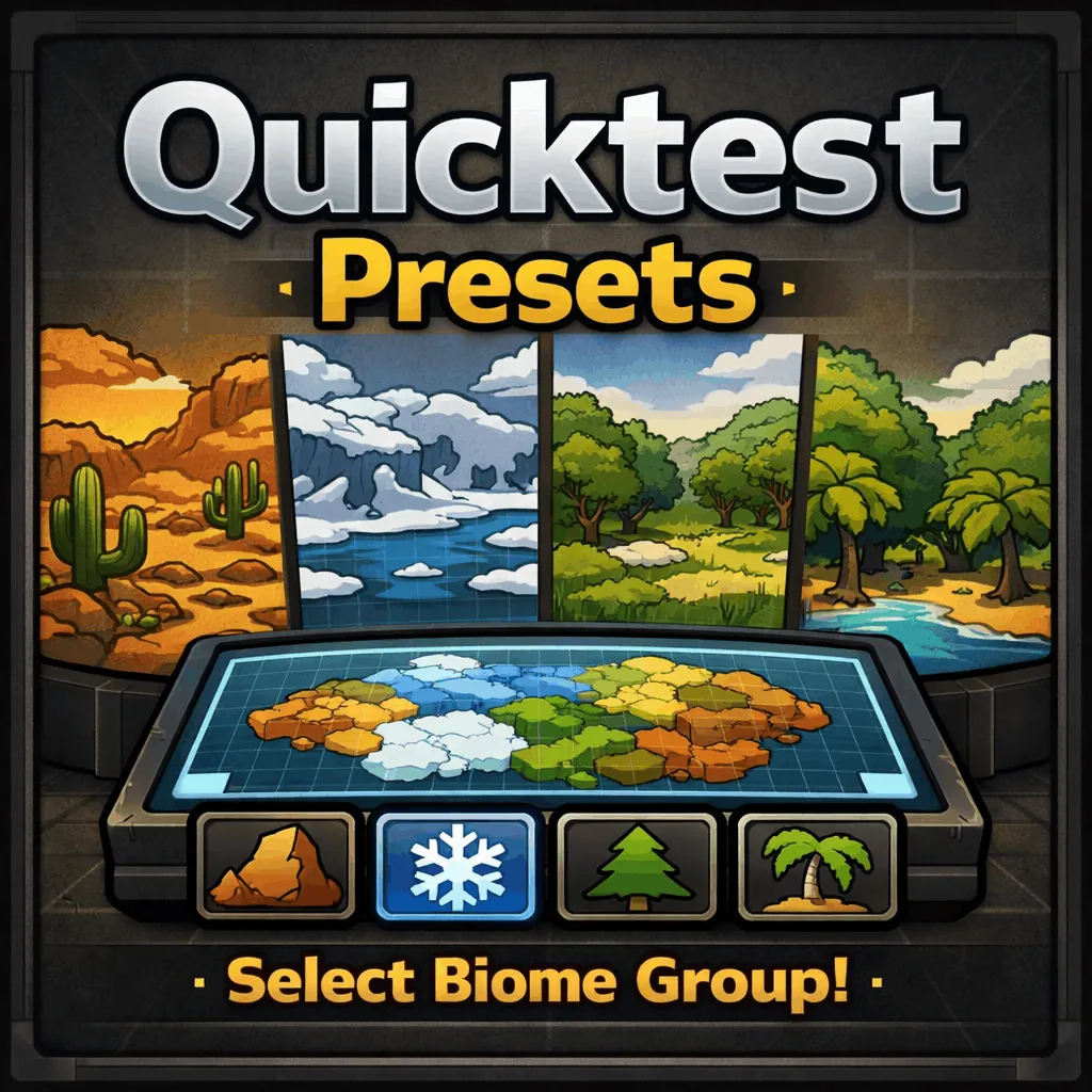 ****Requires Harmony.**** Adds preset selection for Dev Quicktest. Pick a biome group (Temperate, Arid, Tropical, Cold, Extreme) before the quicktest starts to reduce randomness.