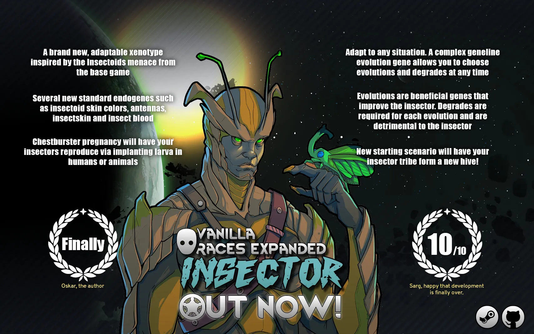 Insector is our final (for now) xenotype mod. It introduces a highly requested xenotype of insectoid-human hybrids with an ability to adapt to any conditions your colony is under. Through the power of geneline evolutions, you can create castes of insectors - a low caste of jelly producers, a caste of warriors with insect wings and ripper blades, a caste of queens that focus on reproduction etc.