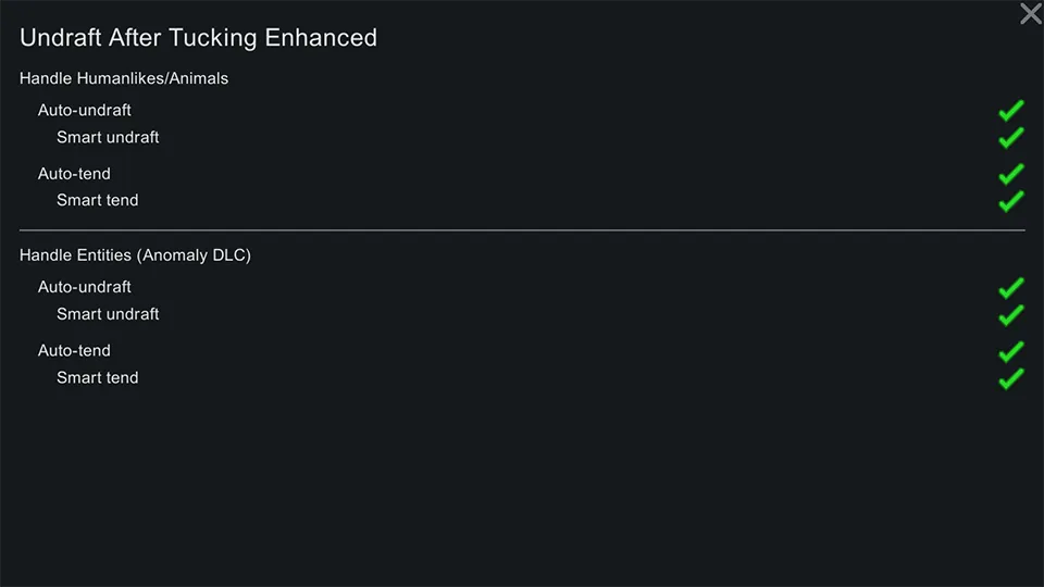This mod expands upon the original [u][url=https://steamcommunity.com/sharedfiles/filedetails/?id=2157495459]Undraft After Tucking[/url][/u] by adding new features. It can be safely added to an ongoing save.