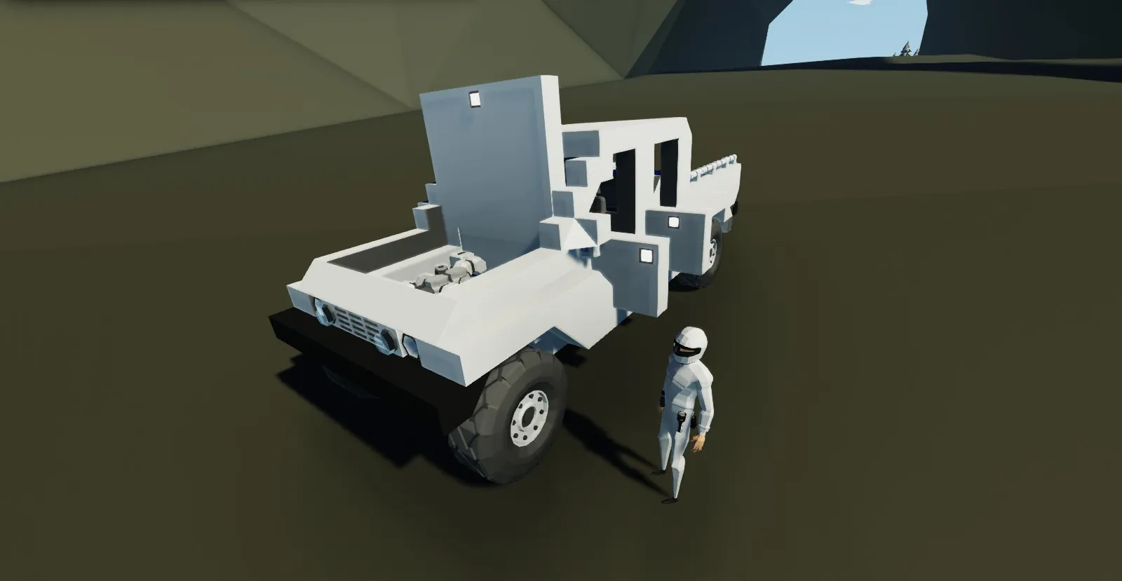 Work in progress, but it's a 1987 Toyota Hilux 4 by 4, currently in white, all the doors work and it works as a whole on a basic level, but i don't know how modular engines work and so currently it is cripplingly slow (top speed of 7.5 m/s). If you know how to make this work better or want more details, Steam friend request me.