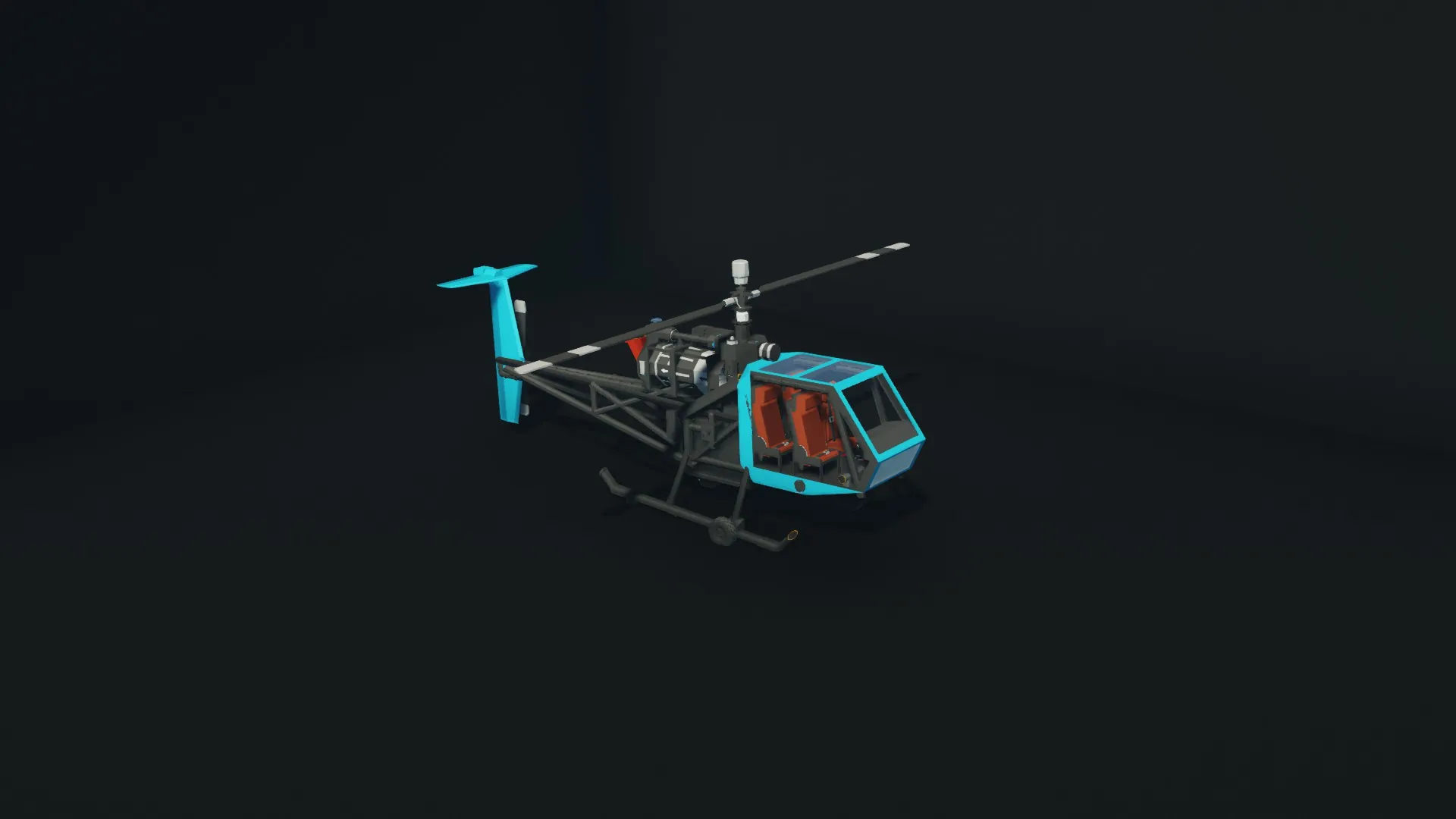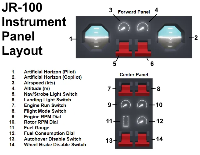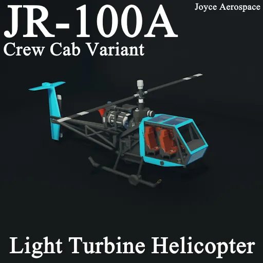 The JR-100A is a larger version of the original JR-100 seating two extra passengers. It is a civilian turbine helicopter designed for a multitude of use cases. It seats four, a pilot, copilot, and two passengers, and is equipped with a small jet turbine, allowing it to cruise at speeds of up to 80 knots. It is small and lightweight, featuring an open canopy and a lightweight pipe-frame design.