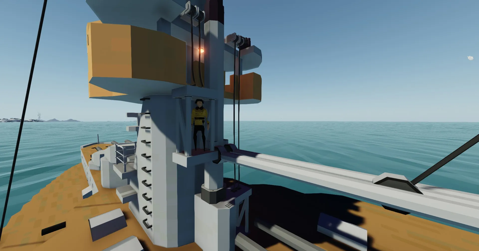 Bridge located in front of first exhaust pipe, on the same flore on sides you can controll side cannons, floor above main guns controll (rear batteri controls by: A/D)