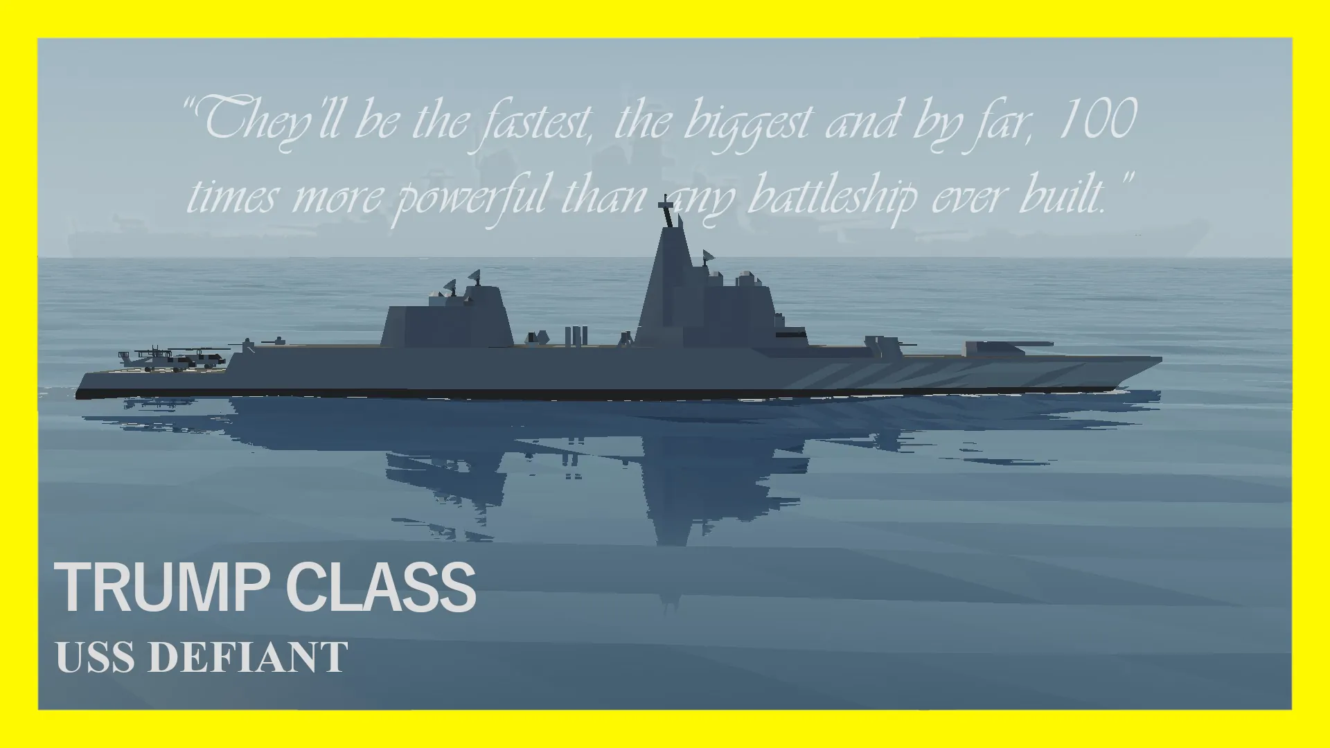 The USS Defiant is the lead ship of The Trump class, a proposed class of guided-missile battleships for the United States Navy announced by U.S. President Donald Trump during a press conference in December 2025.