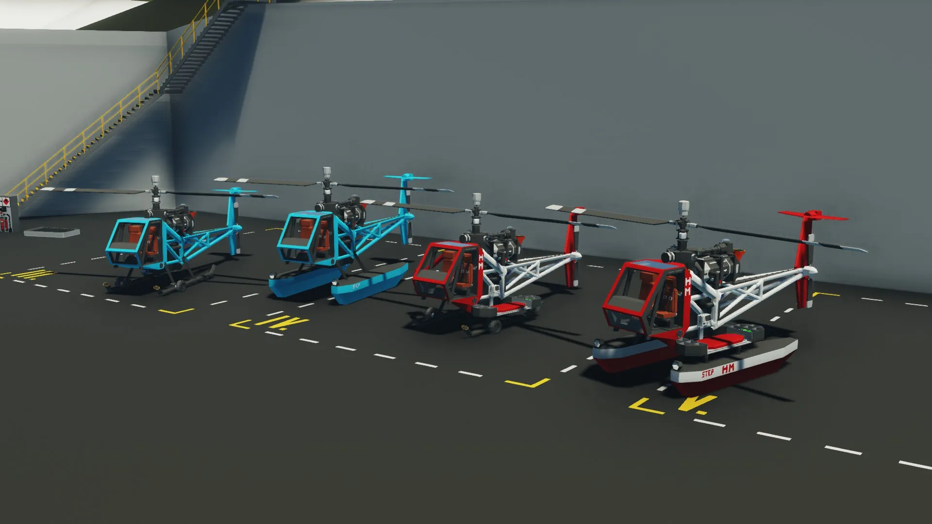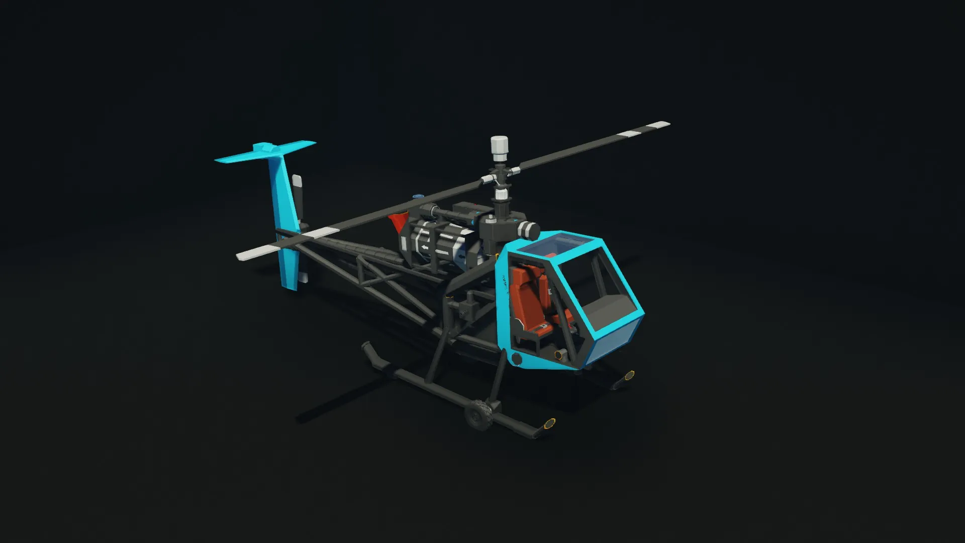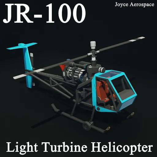 The JR-100 is a small, nimble, civilian turbine helicopter designed for a multitude of use cases. It seats two, a pilot and copilot, and is equipped with a small jet turbine, allowing it to cruise at speeds of up to 80 knots. It is small and lightweight, featuring an open canopy and a lightweight pipe-frame design.