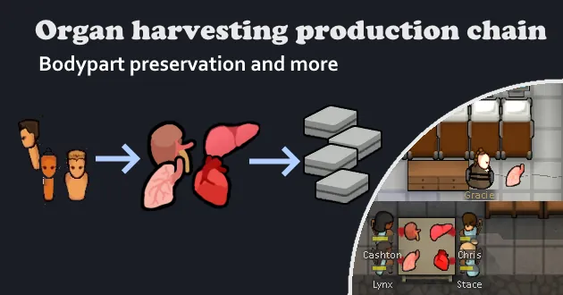 For the future, I will plan to add more harvestable body parts with other mods. More mood buff for cannibal when eating organ raw.