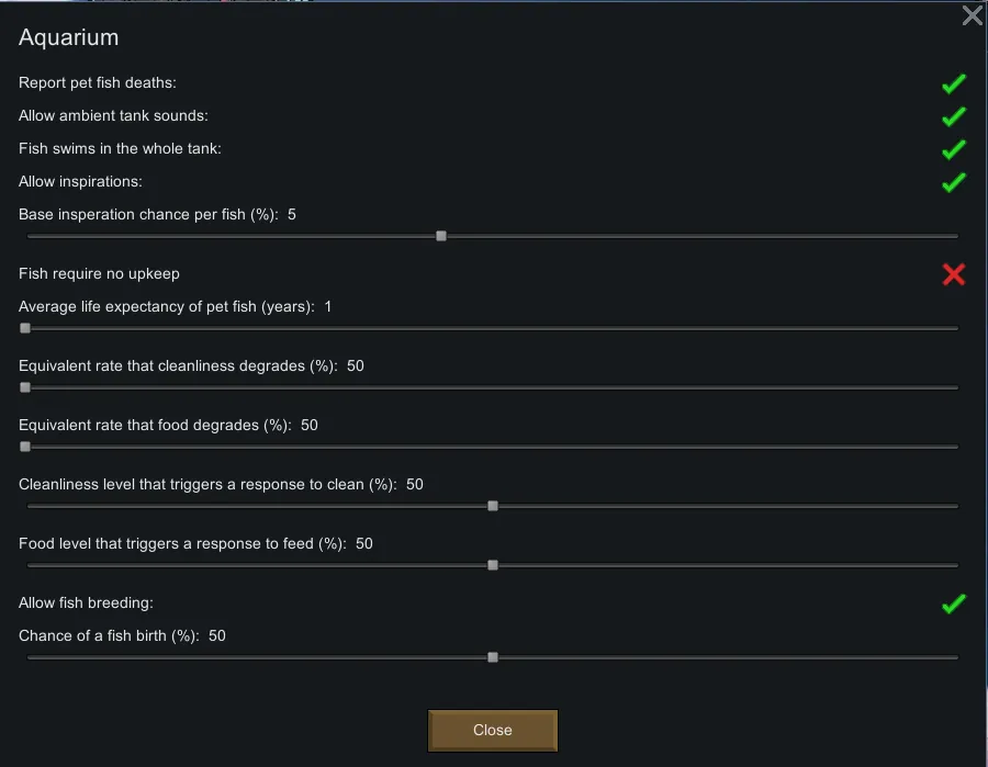 The specifics for this mod have been provided in this PDF: [url=https://steamcommunity.com/linkfilter/?u=https%3A%2F%2F1drv.ms%2Fb%2Fs%21Au3GsmKyQkDYjKlj3xh-1Vd3lD0mlg%3Fe%3Dy5MUhb]Aquarium Notes[/url][1drv.ms]