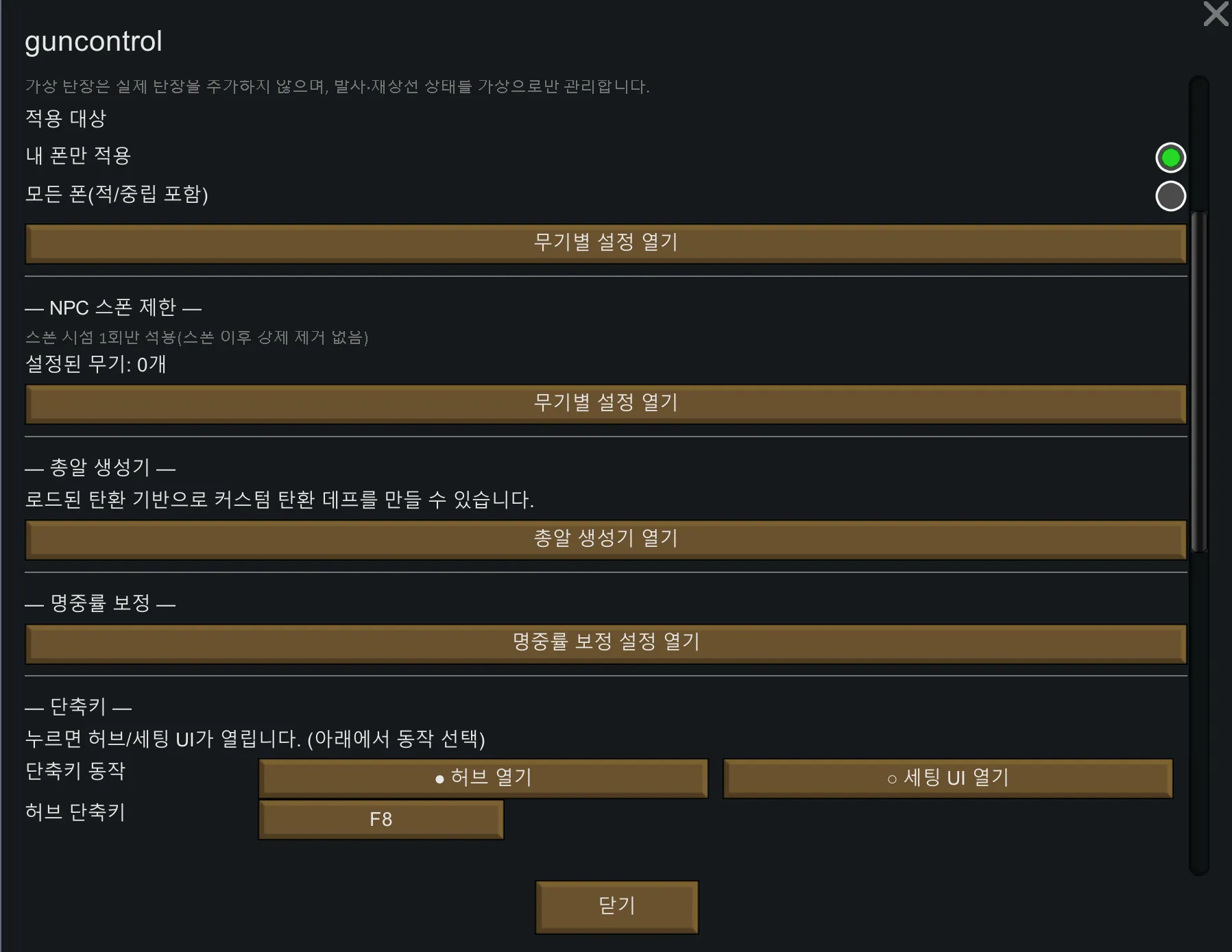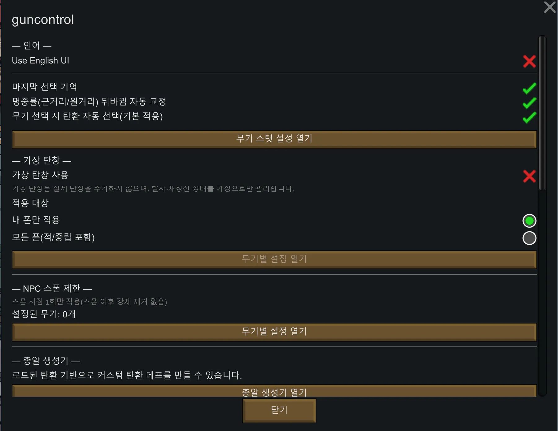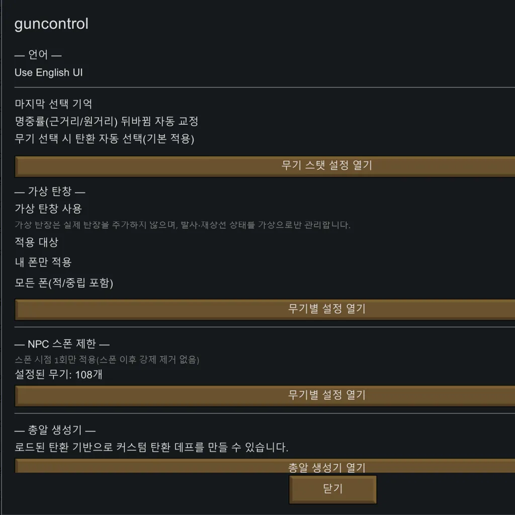 탄환을 편집/삭제한 내용을 게임 재시작 후에도 유지하려면, 탄환 생성기에서 내보내기(저장) 후 로컬 Mods 폴더에 자동 생성되는 guncontrol_generated 보조 모드를 활성화해야 합니다.
