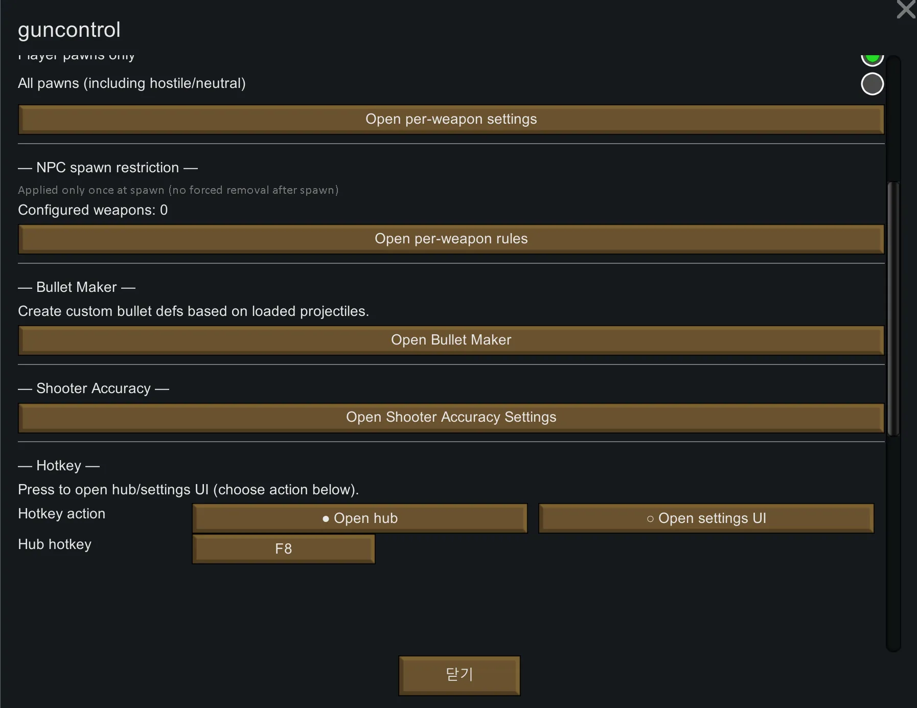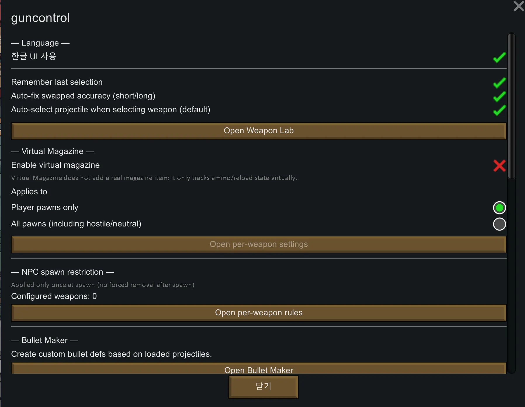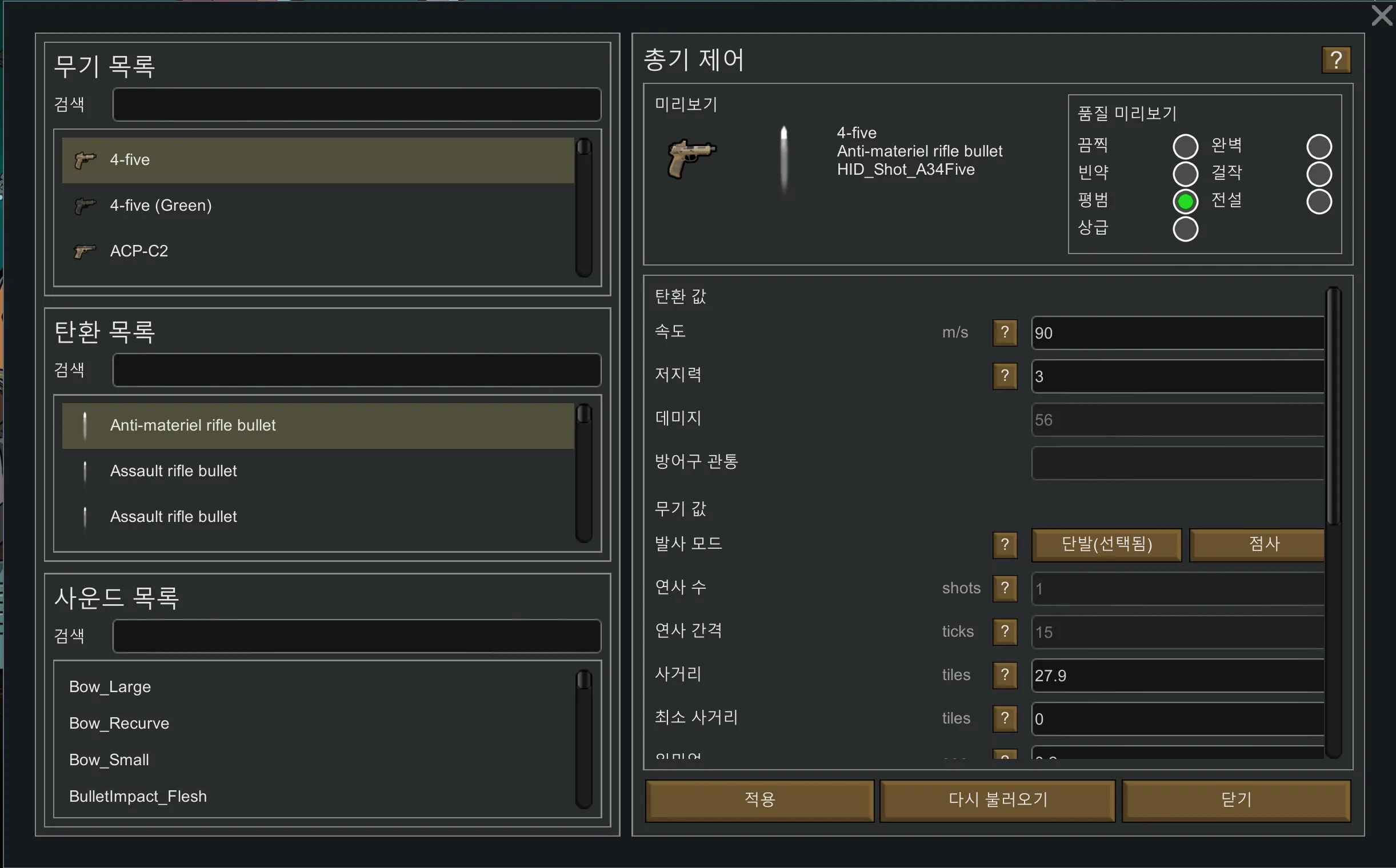 탄환을 편집/삭제한 내용을 게임 재시작 후에도 유지하려면, 탄환 생성기에서 내보내기(저장) 후 로컬 Mods 폴더에 자동 생성되는 guncontrol_generated 보조 모드를 활성화해야 합니다.