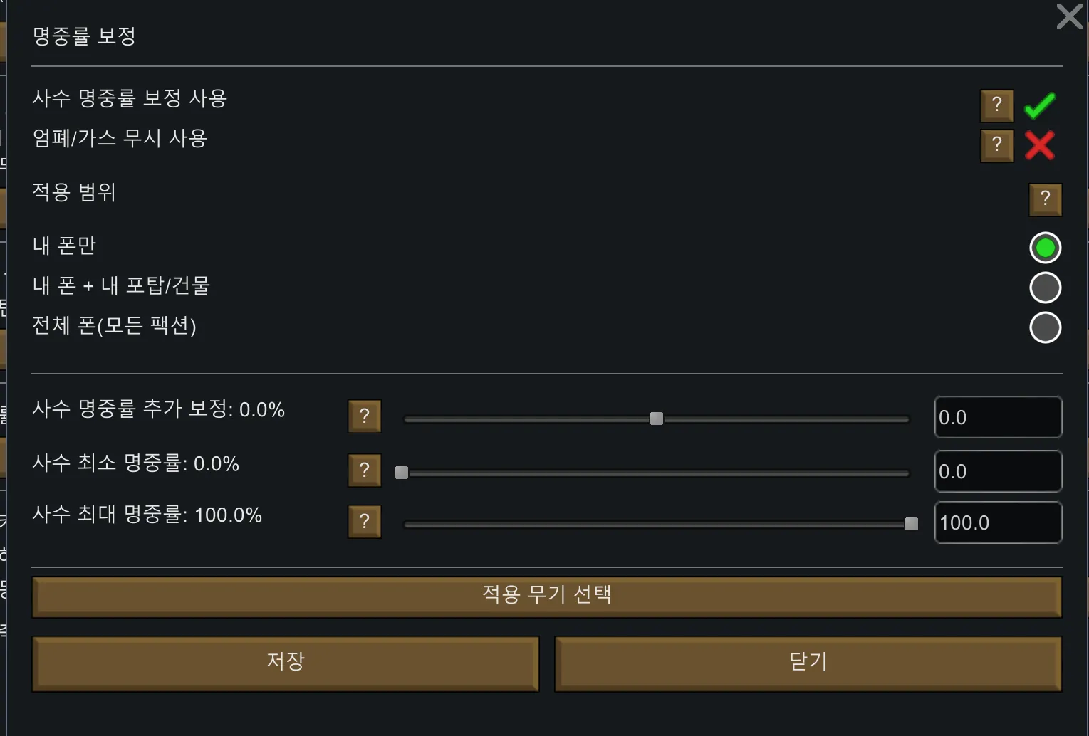 만약 맵불러오기 시 설정한 명중률 값이 무기 스탯 설정에서 설정한 값이 아닐시 무기 스탯설정에서 새로운 값 입력후 맵 다시 불러오기를 하시면 문제가 해결될 수 있습니다