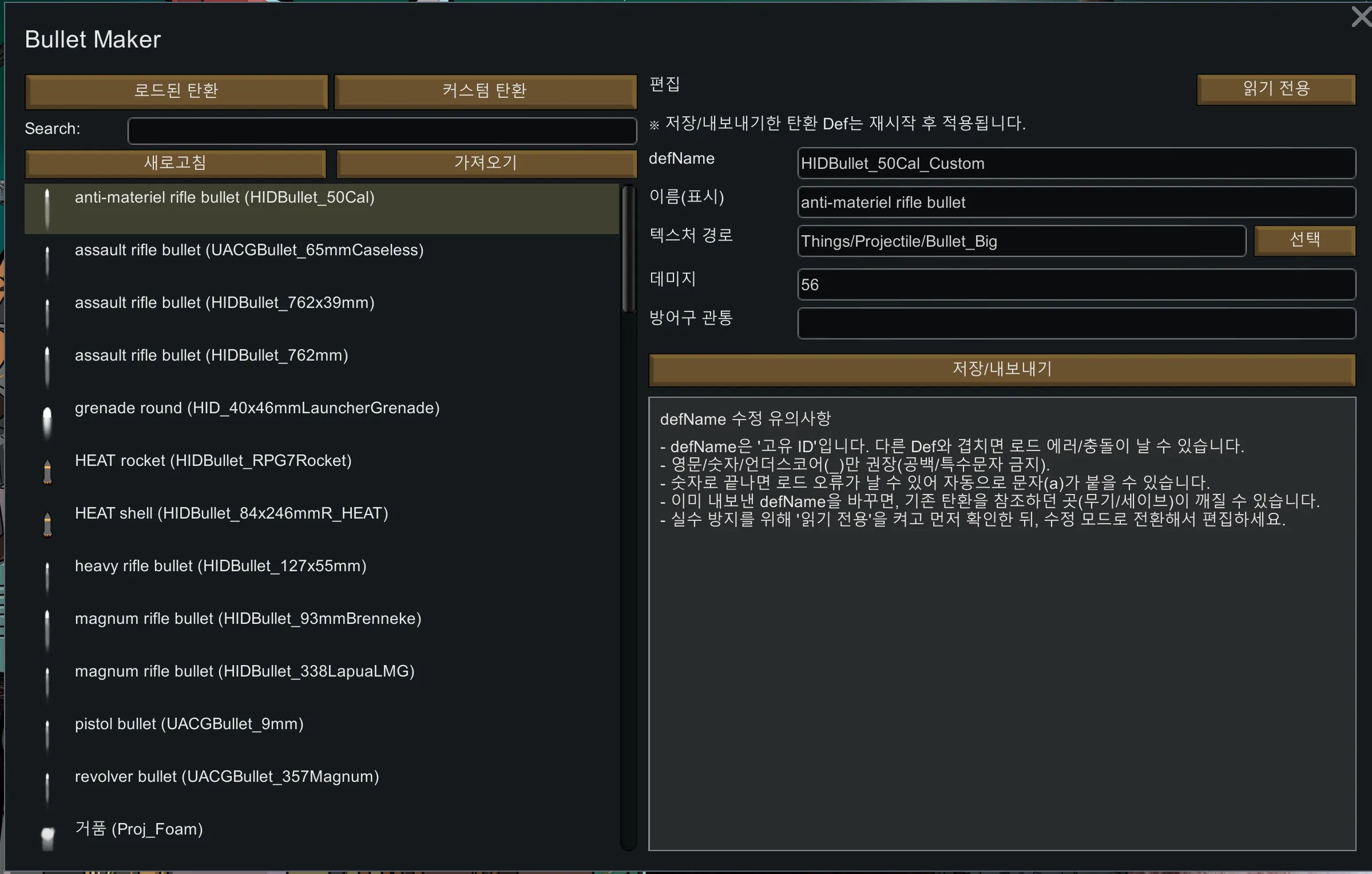 만약 탄환 생성기를 기존에 사용하고 계셨던 상황이신 분들이면 이번 새로운 버그를 수정하면서 로그 에러가 뜰수있습니다 이때는 아무 커스텀 탄환을 저장/내보내기 버튼을 누르시고 게임 재시작을 하시면 로그에러가 없어집니다