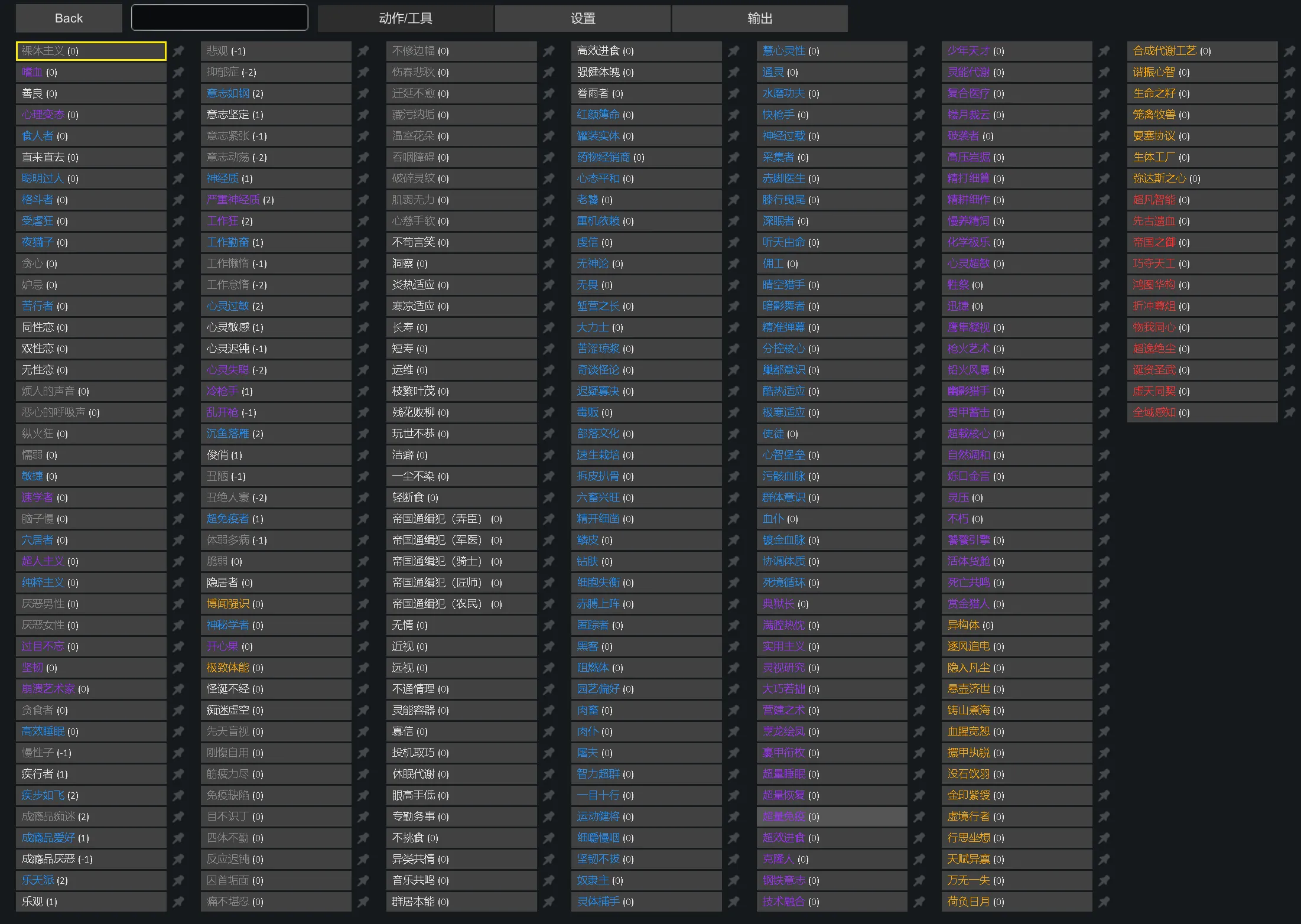 不苟言笑、洞察、炎热适应、寒凉适应、运维、枝繁叶茂、残花败柳、玩世不恭、洁癖、轻断食、帝国通缉犯(弄臣/军医/骑士/匠师/农民)、无情、近视、远视、不通情理、灵能容器、寡信、投机取巧、休眠代谢、眼高手低、专勤务事、不挑食、异类共情、音乐共鸣、群居本能、高效进食、强健体魄、眷雨者、独狼、殉爆、情绪辐振、专注思维、渔夫、共生虫巢、精准弹幕、深眠者