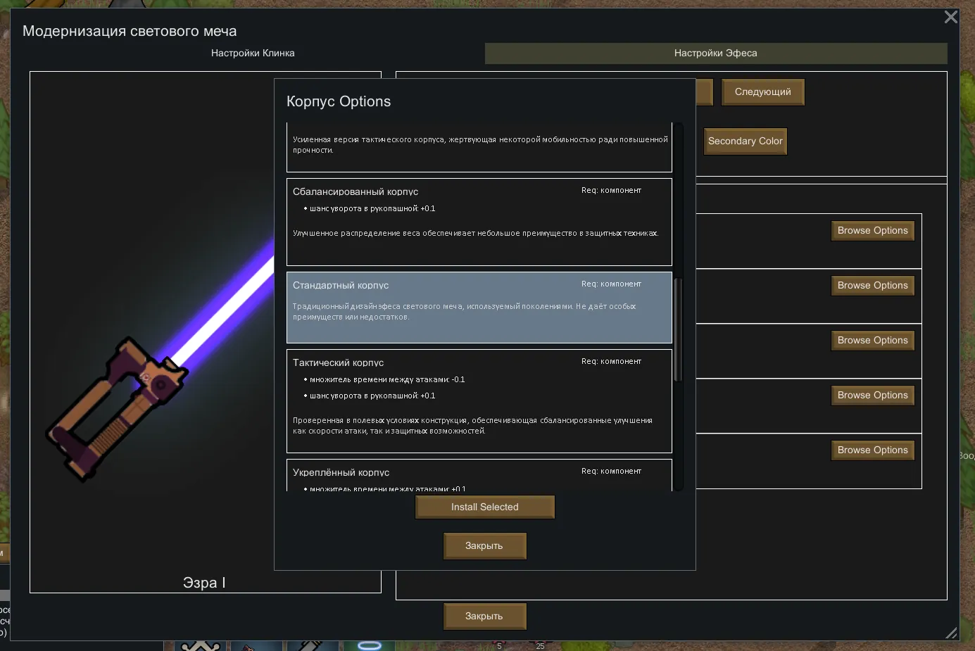 Как и в случае с ксенотипами, тут и добавить нечего. Всю информацию можно буквально из картинок на оригинальной странице мода увидеть. Внутри находится относительно детальная система кастомизации и улучшения световых палок, позволяющая создать идеальное оружие под различные стили боя и тактики. Стоит так же отметить, что использование различных стилей в бою с другими владельцами световых мечей - важная часть механик мода, потому как отдельные формы могут иметь как преимущество, так и слабость перед другими.