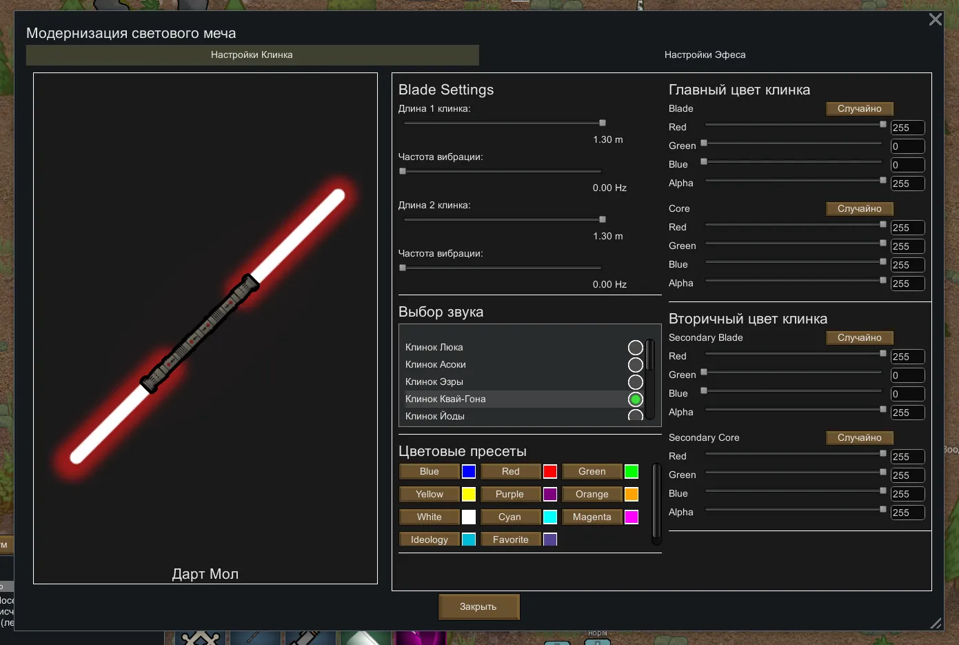 Мод включает в себя семь форм боя на световых мечах, различные кайбер-кристаллы, несколько рандомных событий, и, главное, различные виды световых мечей и систему их кастомизации!