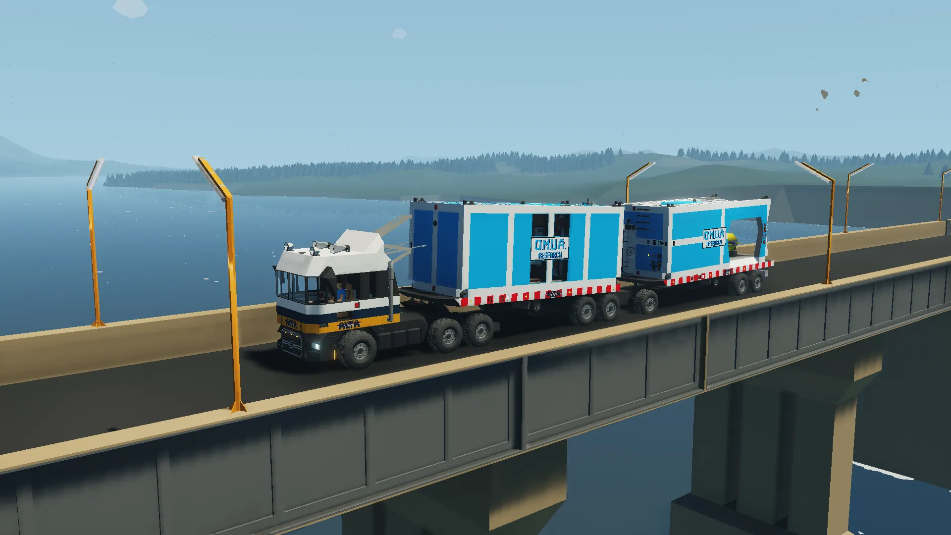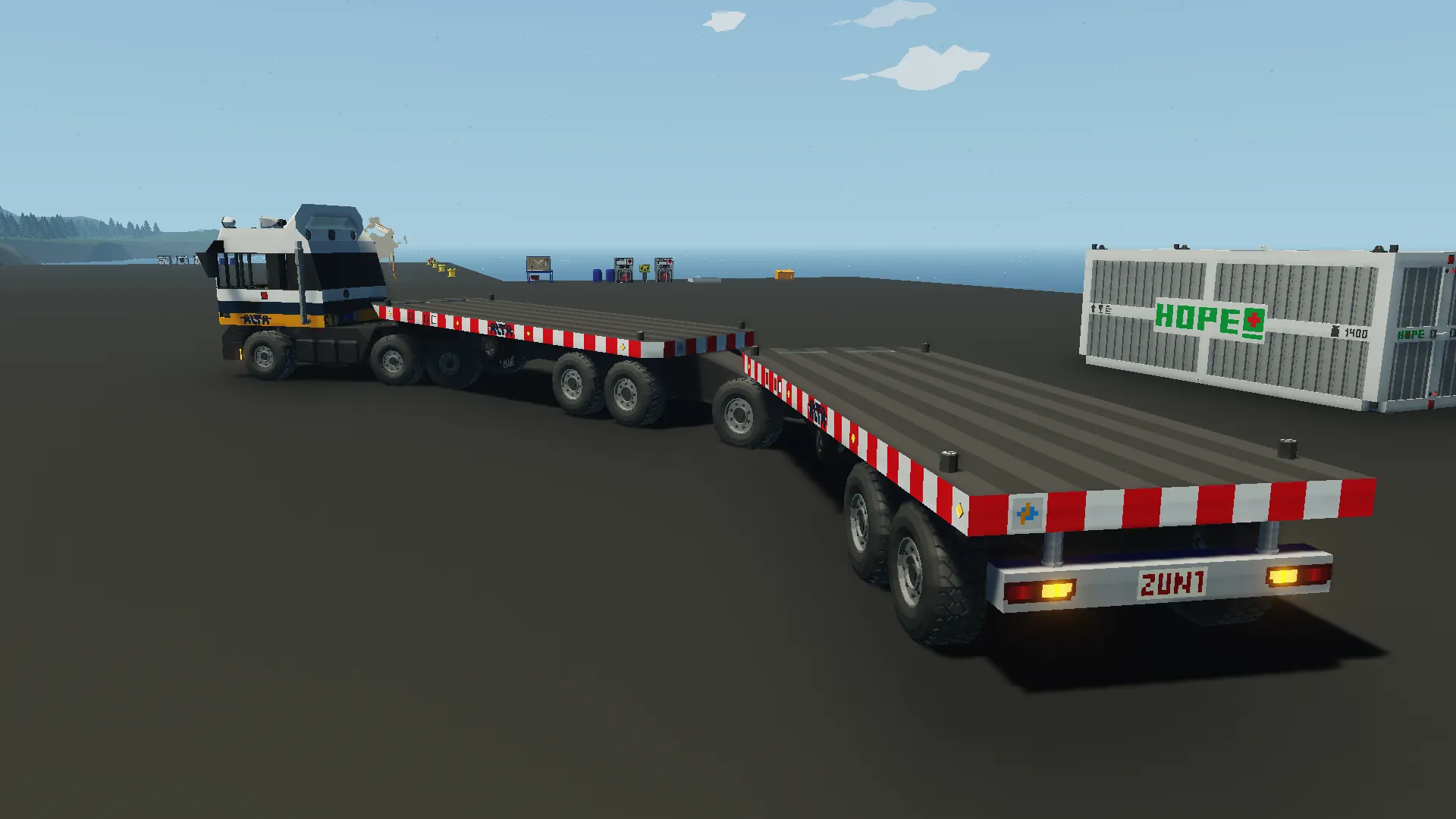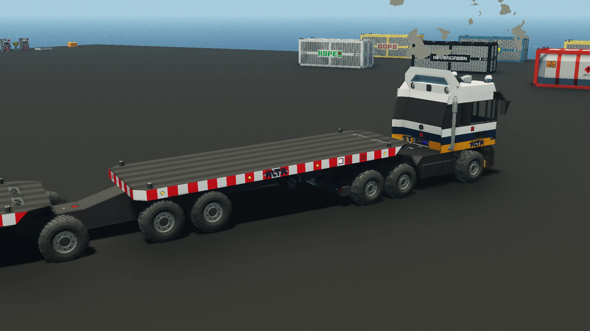 Heavy duty commercial container trailer owned and operated by ALTA Industrial Corp., a (fictional) mining, drilling and transportation company. It has connectors for a standard ISO trailer. The trailer has stands for when not connected to a semi-truck, and automatically pairs the lights and electric elements to the semi-truck that is attached via electric connector. The trailer is also eBoost equipped, which if turned on by a eBoost compatible truck, can allow the trailer to provide power to its wheels. This trailer is intended to be paired with a standard ALTA trailer to create a double trailer.