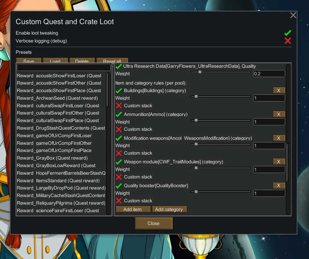This mod is a work in Progress. While it shouldn't break anything, some things like adding animals or removing all original rewards entirely don't work 100% yet. For now leave at least 1 original item and set its weight to 0.1 to "disable" it.