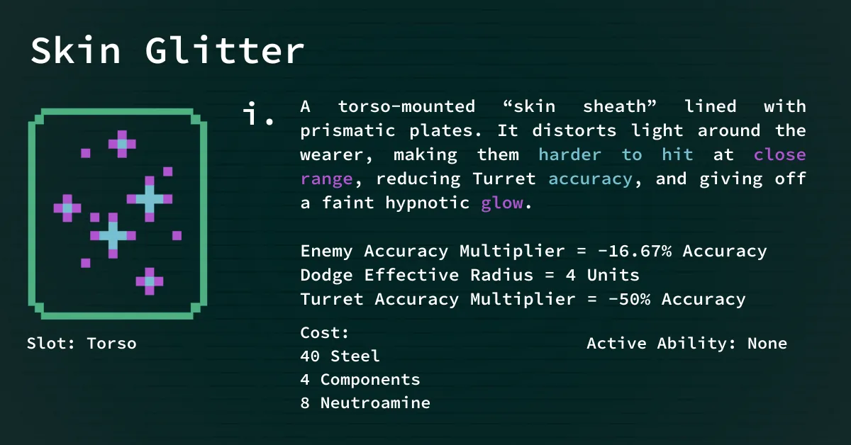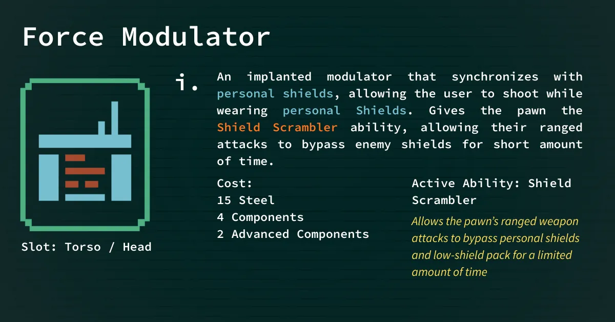 These devices are weak by the standards of the Eaters but powerful by the standards of frontier surgery. They give pawns new senses, new stances, accuracy tools, movement enhancers, and minor battlefield abilities without breaking balance. Every implant is crafted with simple materials and a focus on interesting play, not power creep.