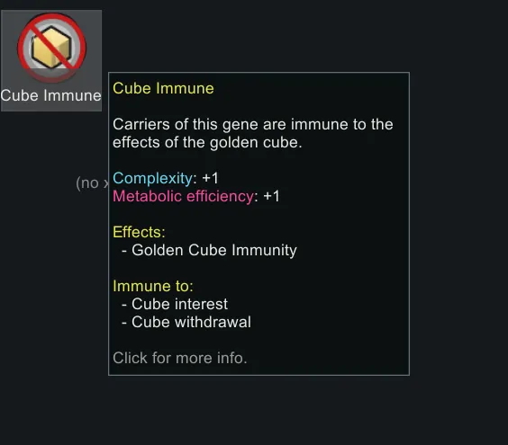Adds Golden Cube Immunity Gene carriers are immune to effects of the golden cube.