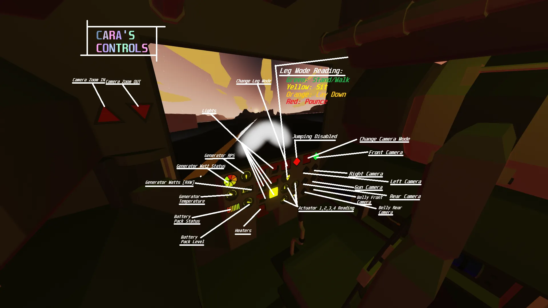 Press hotkey one [1] inside of the "CARA Controller" seat to enable [b] Dance Mode! CARA will lean her legs forward, then lunge forward to ensure each leg has their mag-all hooked in/onto the ground, then she will dance left and right- respectfully getting "Jiggy with it". [/b]