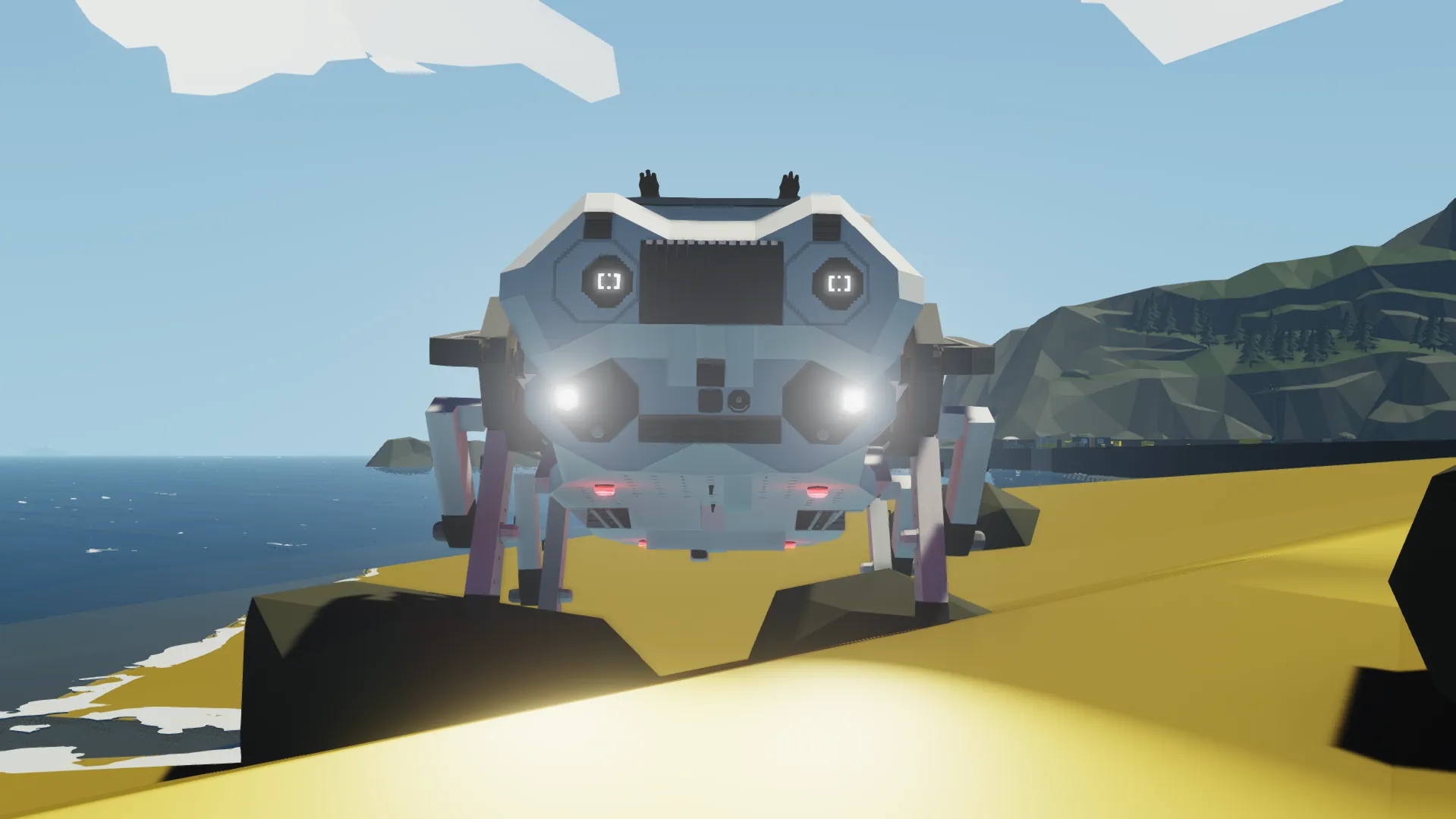 Sadly- due to the way Geometa has designed StormWorks, ropes and two entities rubbing on each other don't act as they would, so I decided to make some "Actuator" looking pivot designs and made each leg powered by a twisting "Actuator" and a forward / backwards "Actuator" to move CARA. This CARA has many different features. This version of CARA has an additional feature. You can now enable or disable the Leg Resetting. When you let go of W, disabling the Leg Resetting will not make the legs reset to zero [0]. This is recommended to be [b] off [/b] when you are climbing / offroading.