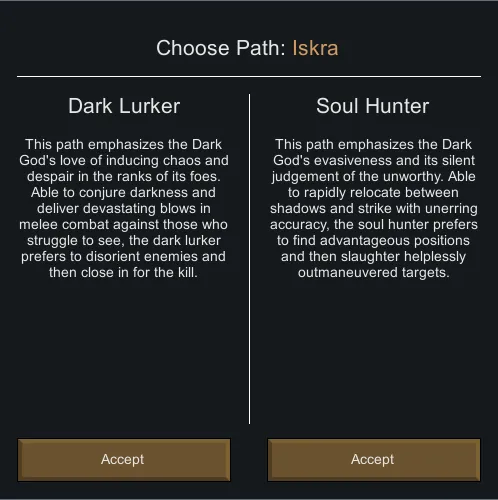 [*] The divine titles of Dark Lurker and Soul Hunter. These paths of my justiciars - call them "subclasses" only if you wish to fear your own shadow - may be followed by any acolyte found worthy of the rank.