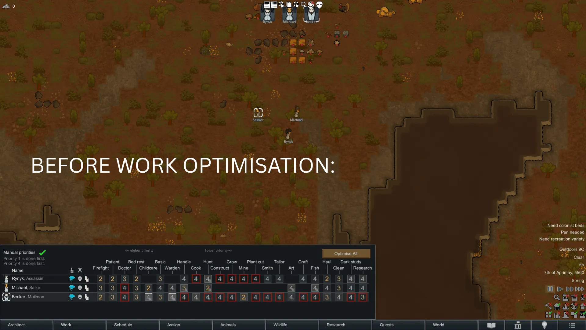 Update: 1.0.2 - The optimizer now compares colonists against each other instead of using fixed thresholds, so a colonist with Mining 4 gets Priority 1 if they're the best miner in the colony (× 3.0 specialisation boost), ensuring the most capable colonist for each task is always prioritized regardless of absolute skill level.