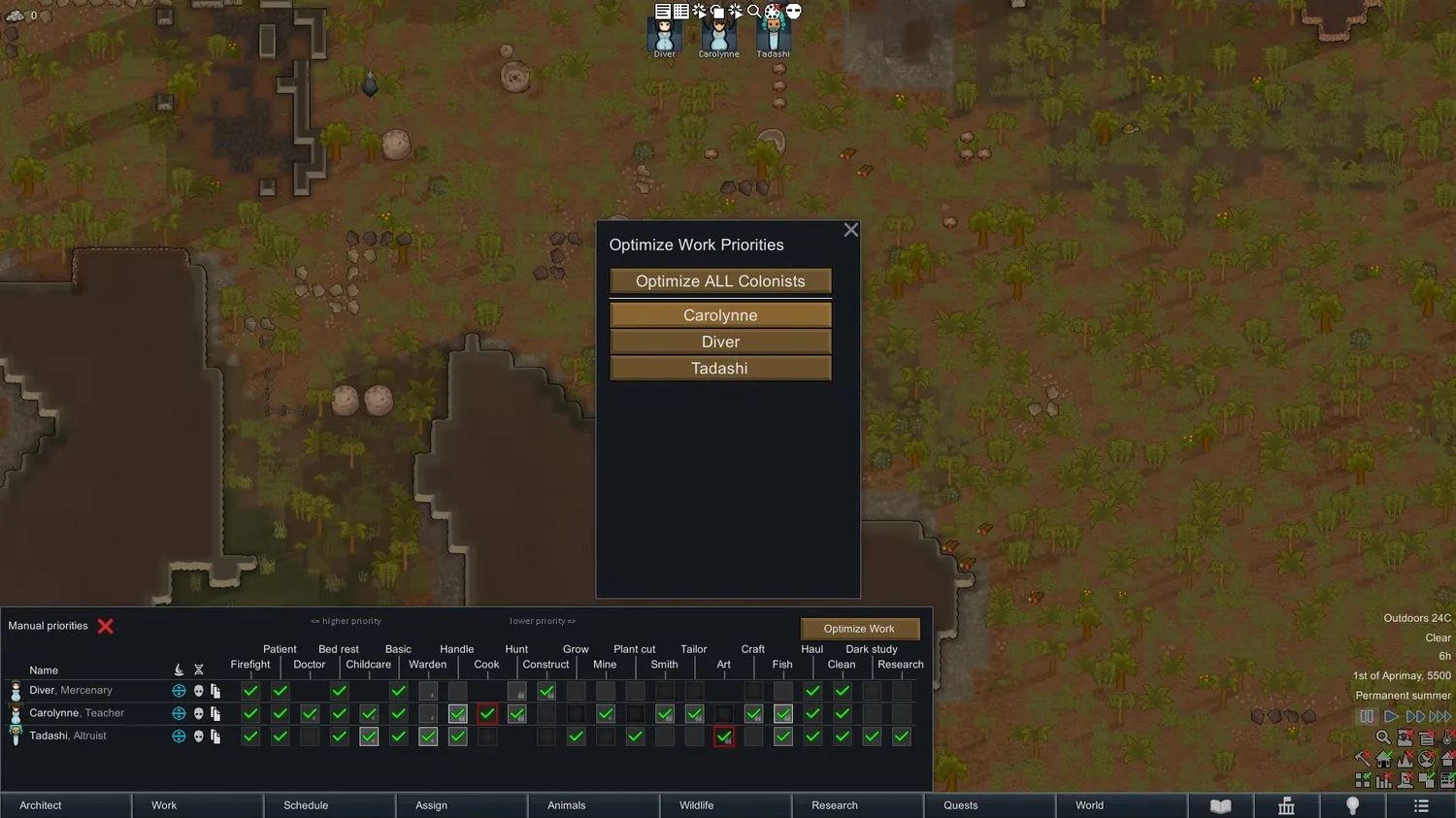 Automatically assigns the best work priorities for every colonist based on their skills, traits, passions, and limitations.