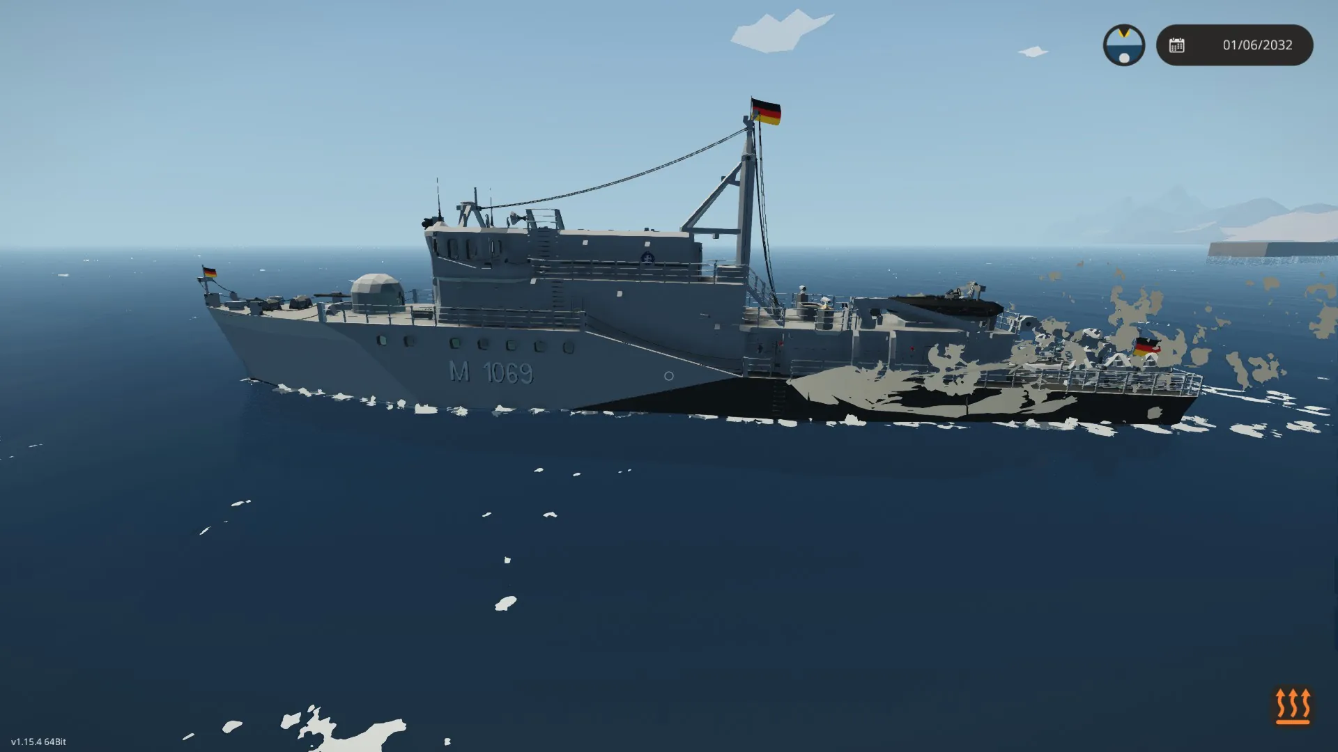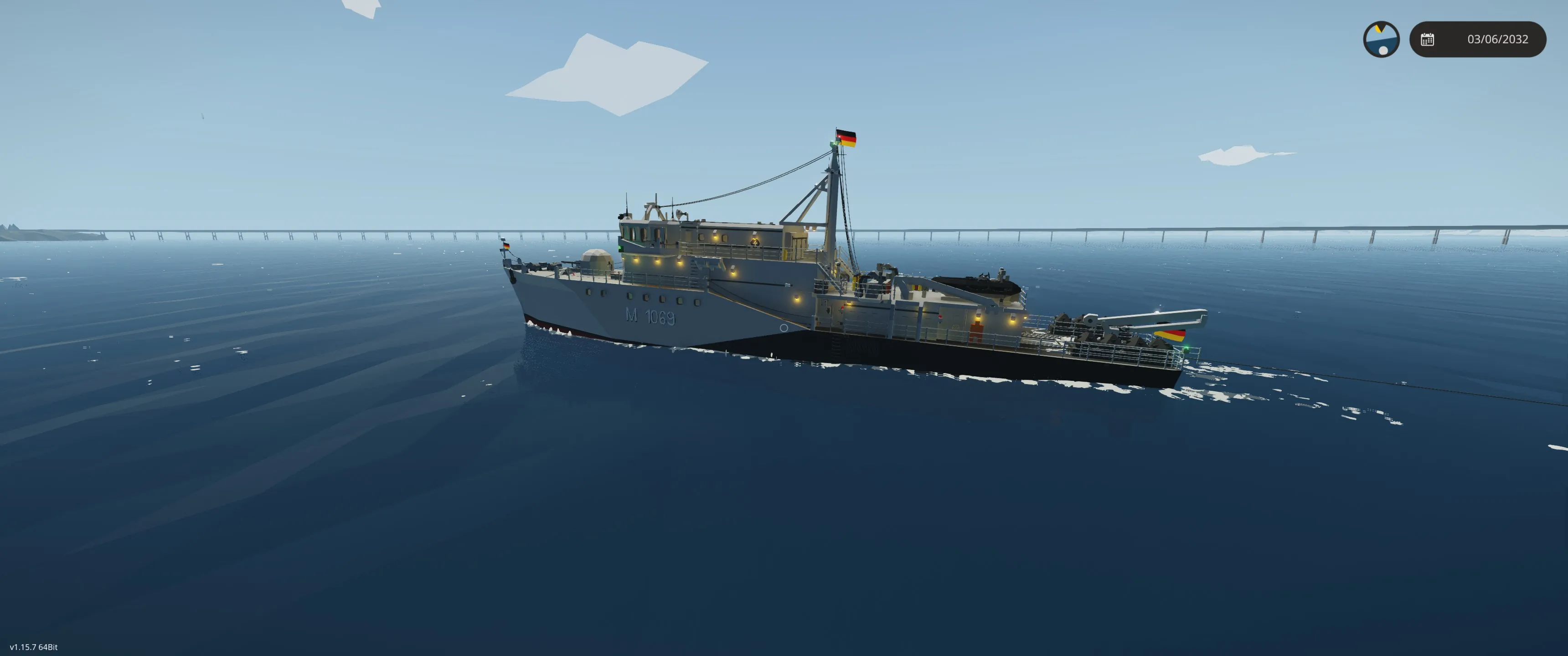 Based on the Minehunter-Vessels of the Frankenthal-Class of the German Navy. The Vessel features an automatic 76mm Cannon, 2 MLG 27 Stations and a manual Machinegun. It carries up to 10 Sea-Mines (Depht up to 40 m) and an Cable-bound ROV to hunt for Mines. It is still WIP, but now the Engine shut start relaiable.