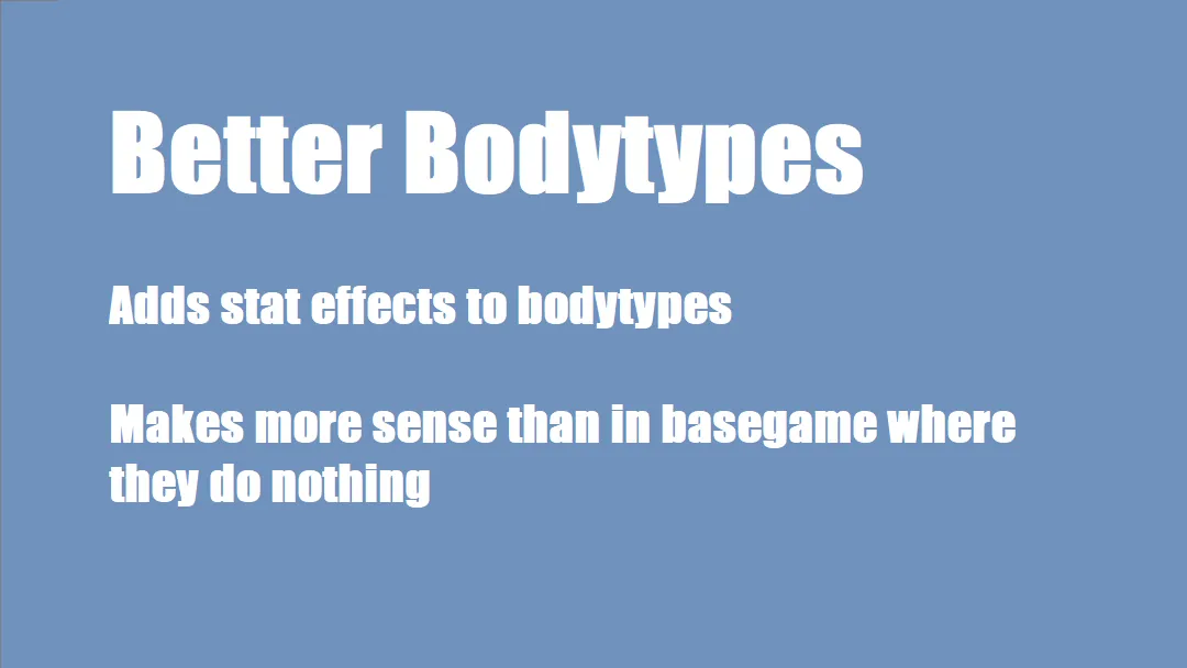 This mod causes different body types to have an impact on stats. This mod adds a variety of stat effects to body types. Hulk pawns will be able to carry more and hit harder, in exchange for needing to eat more and being less capable at dodging and stealth. Thin pawns consume less food, are stealthy, and are good at dodging but don't hit as hard and can't carry as much. Fat pawns will eat more and move slower but are less likely to have a mental break and have some resistance to the cold.