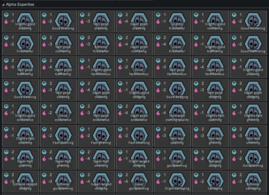 Before release, there were "anti-expertise" genes. These were removed because they were basically free metabolism on any pawn not using the stat they influence.